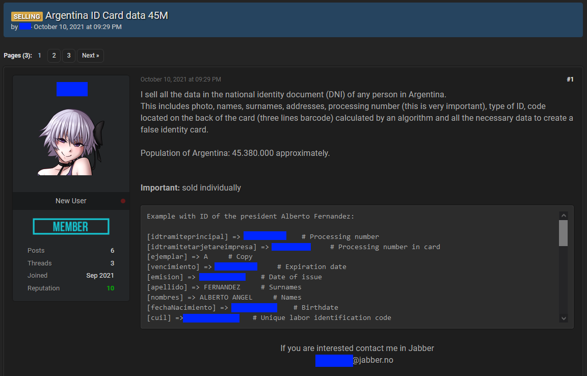 This just in. The Record reports that a hacker breached the Argentinian government’s IT network and stole ID card details for the country’s entire population. That data is now being sold online.