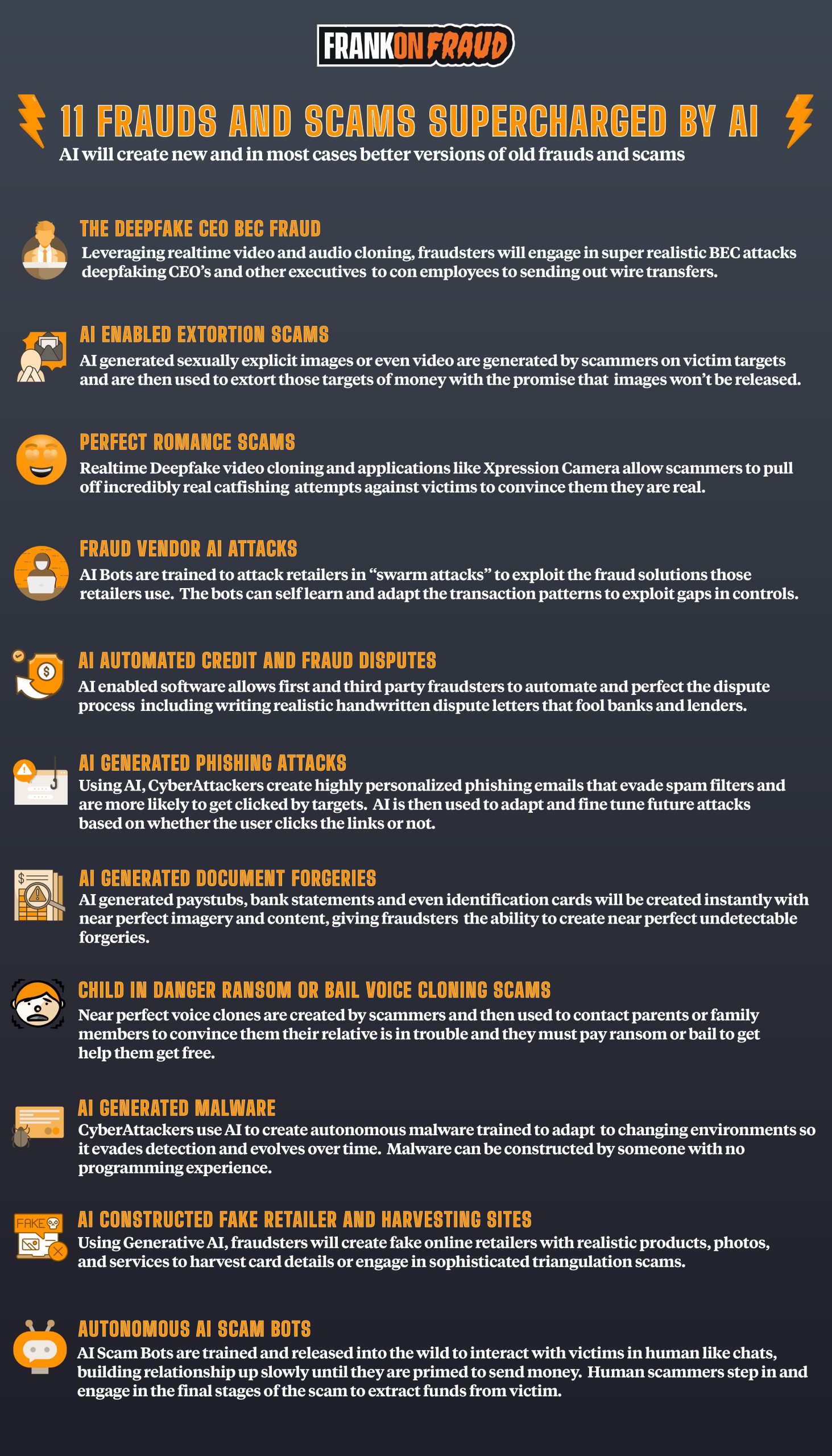 I created this handy infographic of 11 frauds and scams that AI will supercharge⚡.