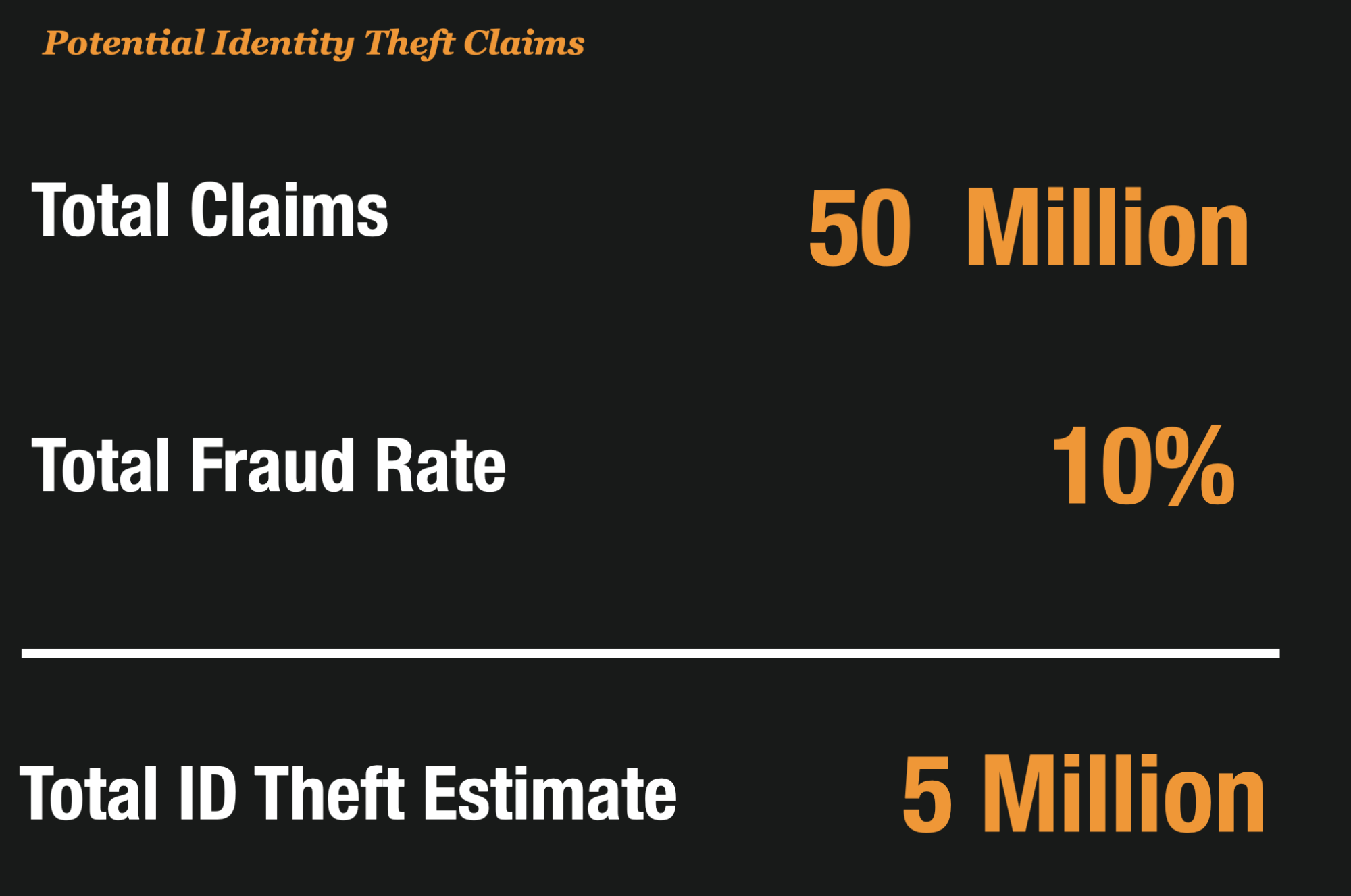A quick back of the envelope estimate I came up with is 5 million Americans could have been victimized by identity theft due to the unemployment fraud that is sweeping the nation.