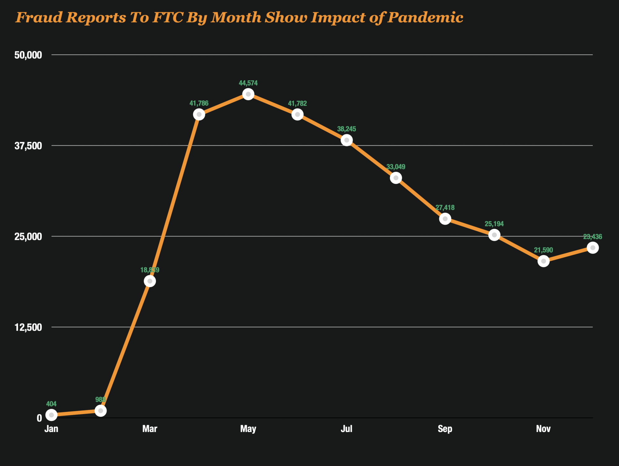 When you break out the FTC fraud reports by month, you can see the dramatic impact the pandemic had on fraud. In March 2020, when the lockdowns began to take hold, fraud shot up immediately.
