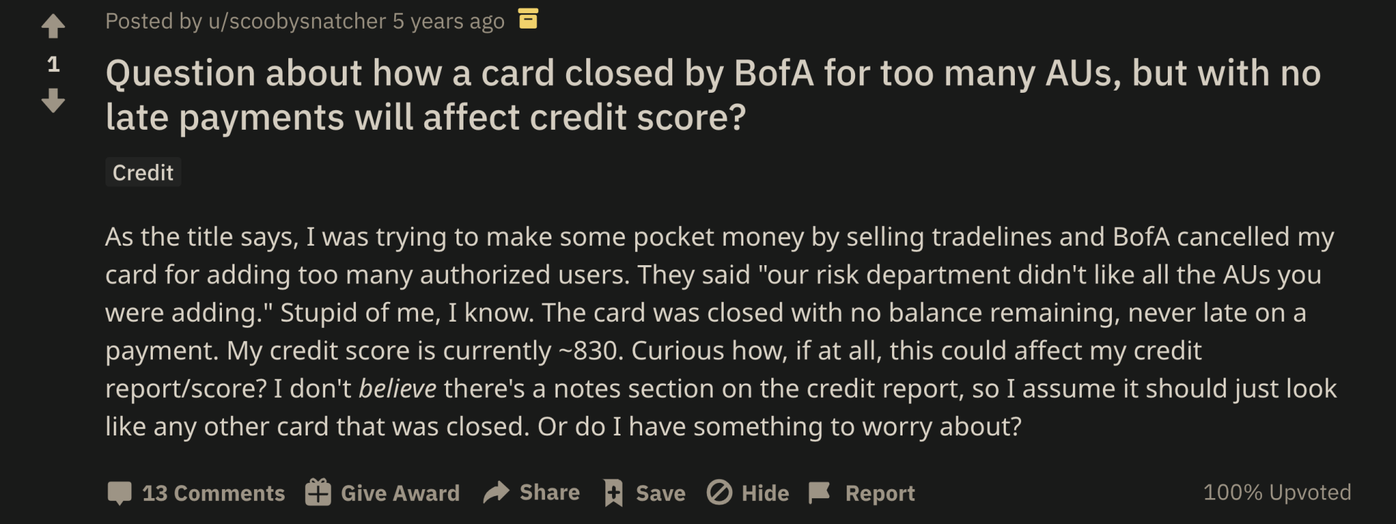 This unlucky tradeline seller found this out the hard way when Bank of America closed his account after he added too many authorized users.