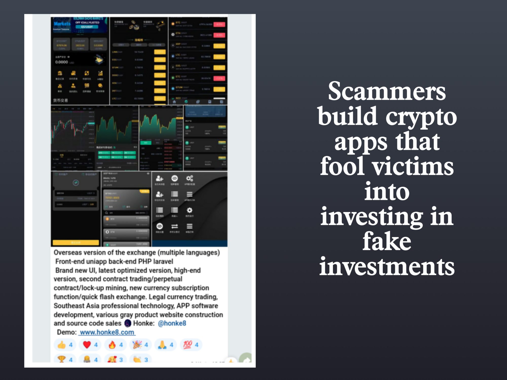 Services offered on Huione Guarantee include creating fake crypto apps and websites designed to trick victims into depositing their money into crypto investments and then showing those investments rising over time.