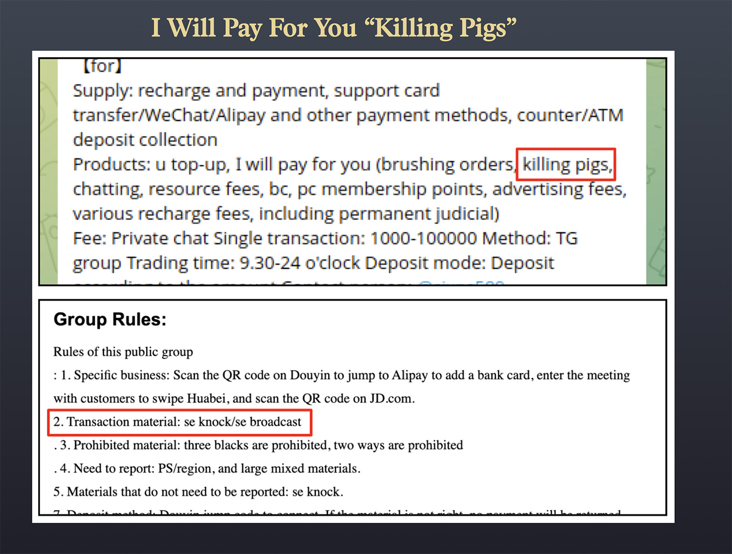 - Laundering sex extortion and pig butchering proceeds