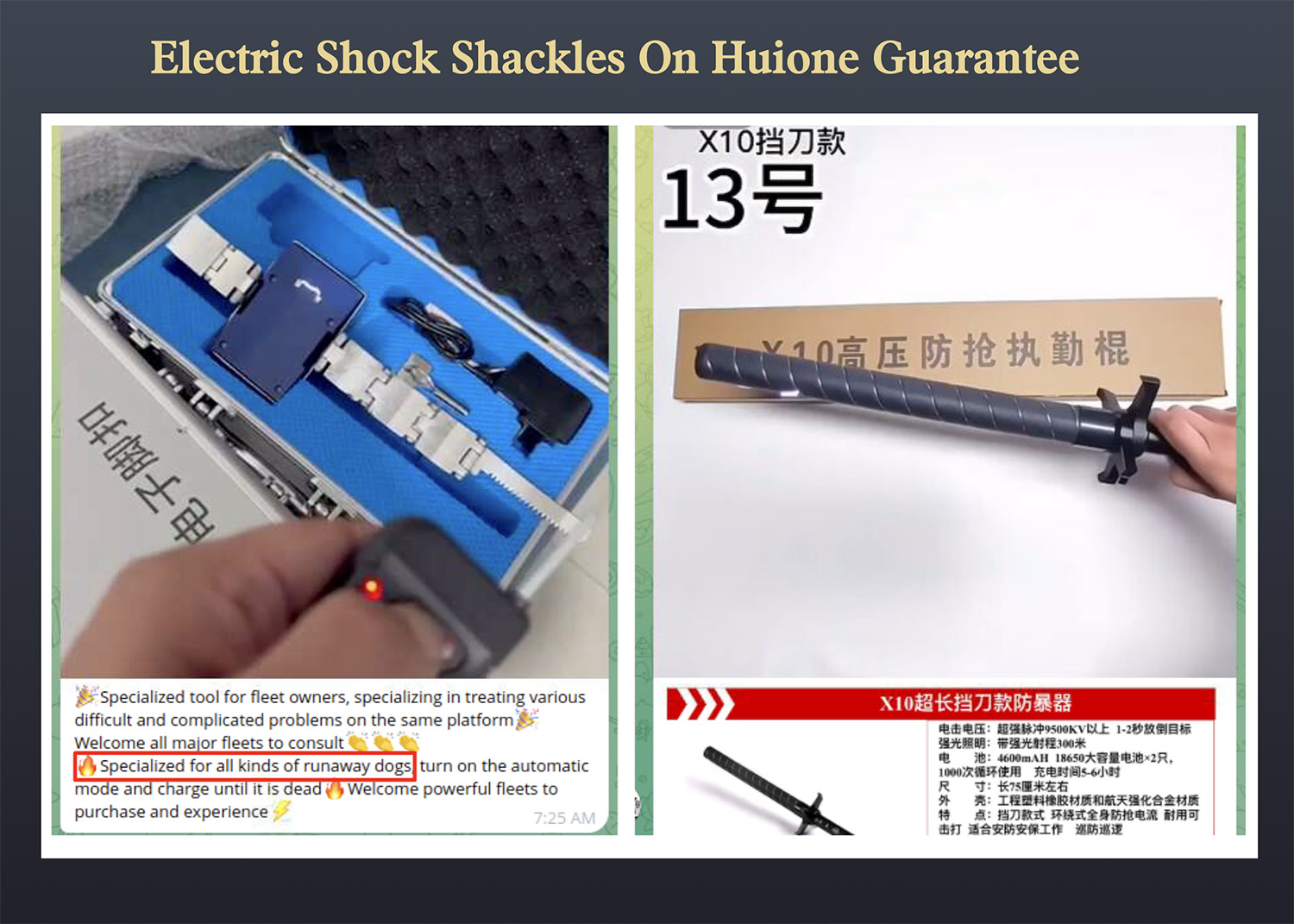 Some of the products being offered on Huione Guarantee include electric shock shackles and electric batons. These are used to manage the slaves trying to escape the scam compounds.
