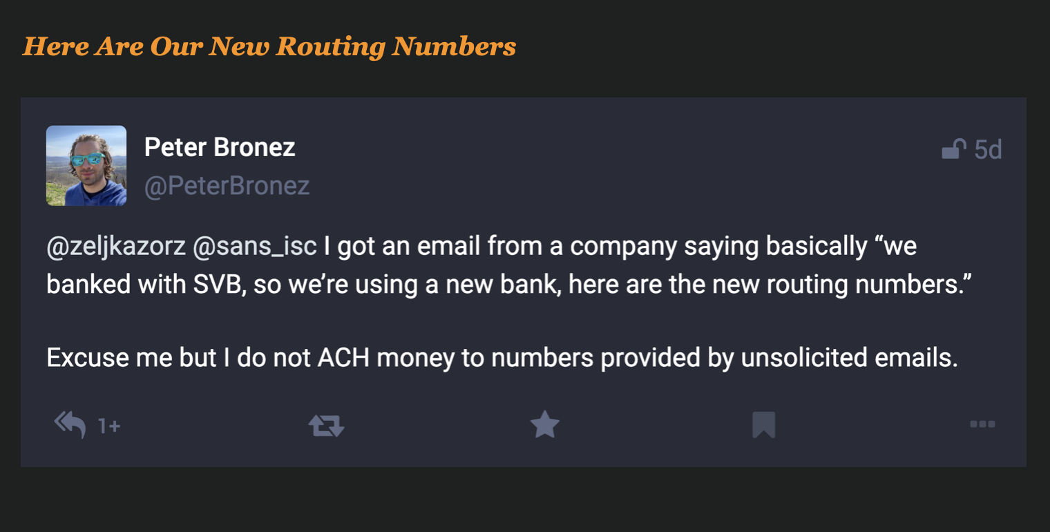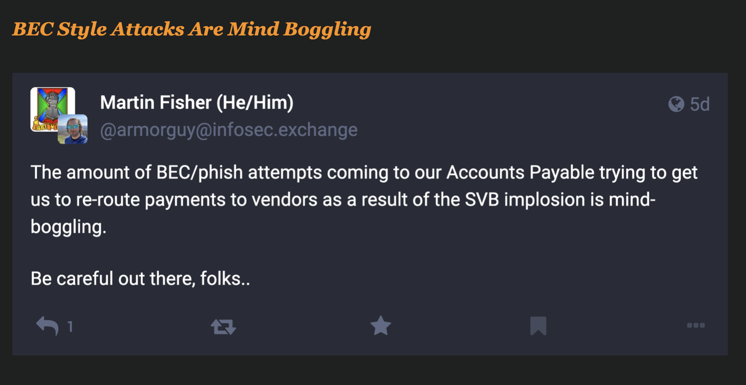 “The amount of BEC/phish attempts coming to our Accounts Payable trying to get us to re-route payments to vendors as a result of the SVB implosion is mind-boggling.”