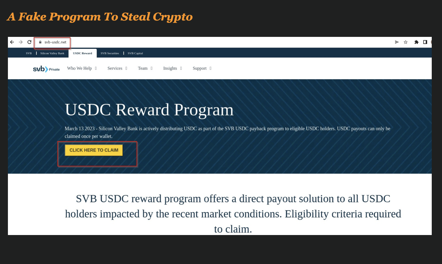 These phishing sites, namely svb-usdc[.]com and svb-usdc[.]net, have set up a bogus USDC reward program claiming that “Silicon Valley Bank is actively distributing USDC as part of the SVB USDC payback program to eligible USDC holders.” They aim to steal cryptocurrency from the victim’s account by offering them free USDC.