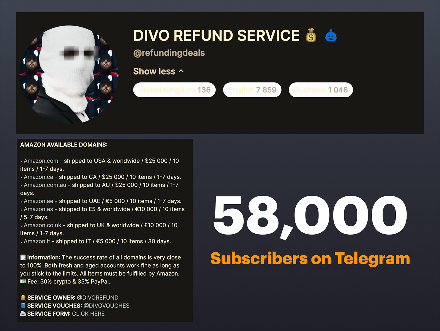While investigating him, they discovered he had set up another massive operation on Telegram called DIVO. The Telegram channel and service were immediately closed when Amazon exposed it, and all message history was deleted. The refund service boasted over 58,000 subscribers.