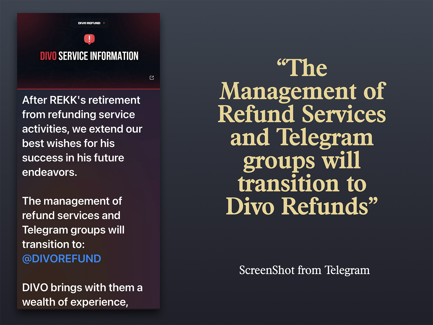 The first message on Divos Refunds claimed that REKK refunds had “retired” from refunding service activities.