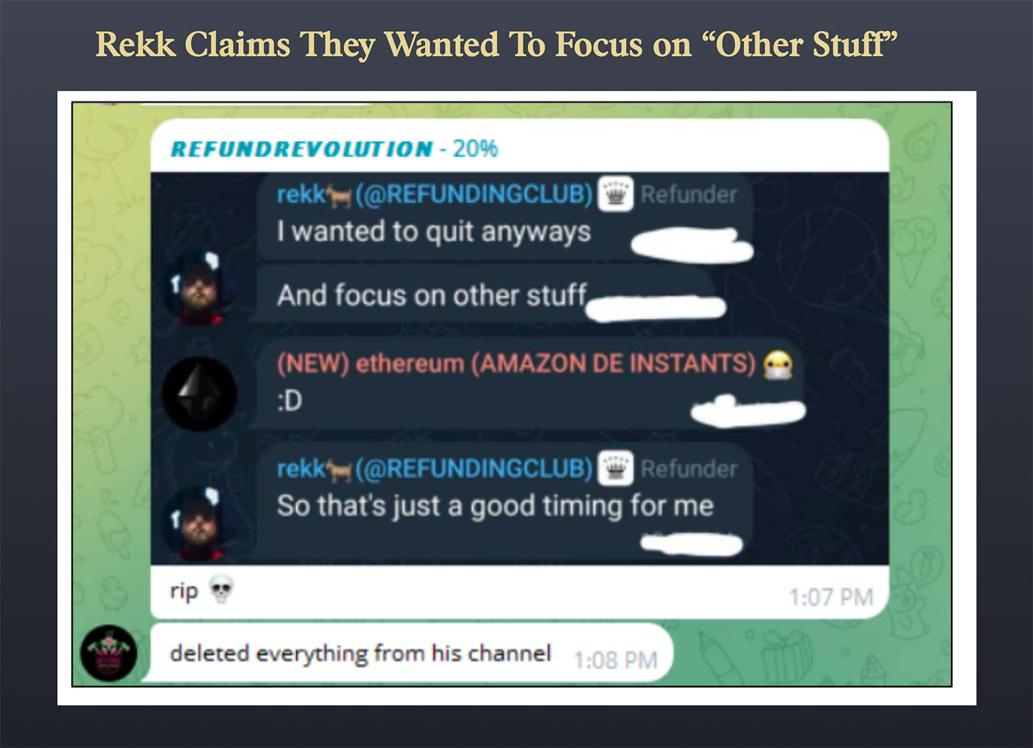 After Amazon exposed REKK, instead of shutting down the operation, he and others merely re-emerged as “DIVO Refunds” and continued their fraud scheme against Amazon. In a screenshot, Amazon showed that he wanted to focus on “other stuff”; however, that was not the case.
