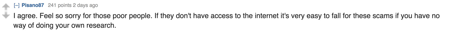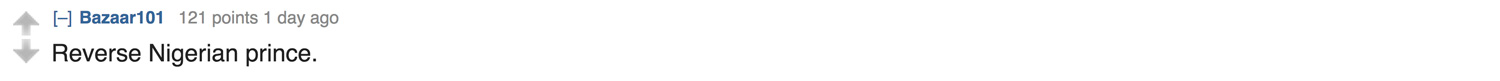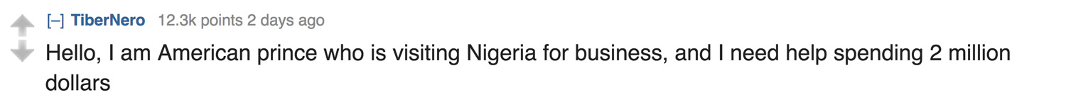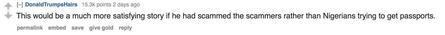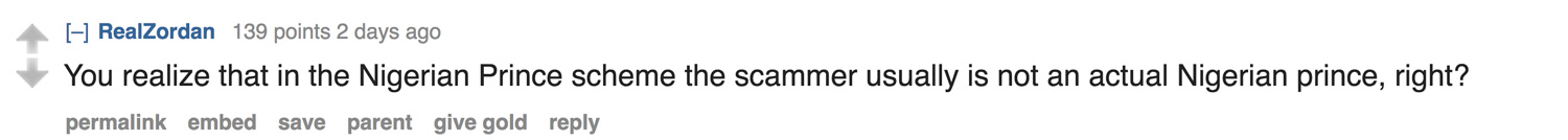 It appears that the irony of the situation was not lost on Reddit.  A post to Reddit announcing the story was entitled “American Man Arrested for Scamming Nigerians Out of $150 Million”