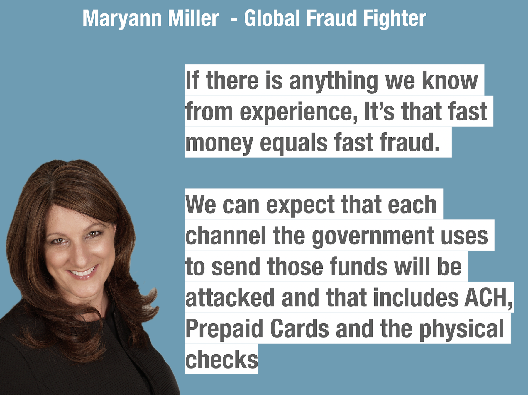 “If there is anything we know from experience,” advises Maryann Miller Global Fraud Expert, “is that fast money equals fast fraud. We can expect that each channel the government uses to send those funds will be attacked and that includes ACH, Prepaid Cards and the physical checks.”