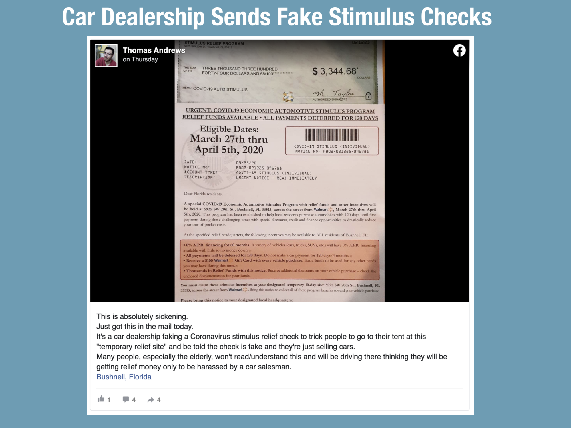 Reports are already flooding from individuals receiving bogus stimulus checks in the mail. In one particular case, an auto dealership used the bogus stimulus check mailing to lure unsuspecting consumers the lot to purchase cars under the “Automotive Stimulus Program”. The check looked real but it was actually a “discount” towards the purchase of a used car.