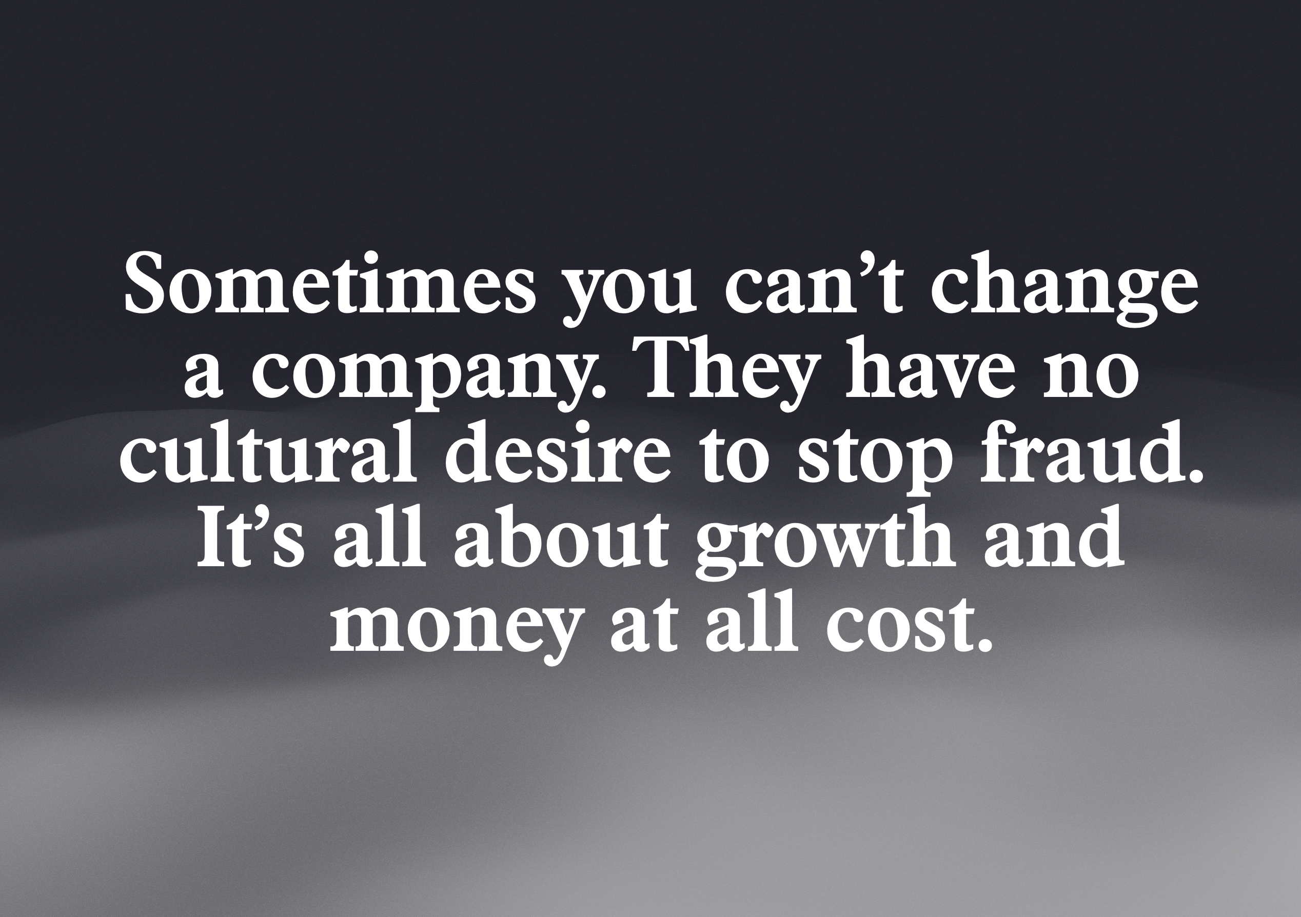 Sometimes, you can’t change a company. They have no cultural desire to stop fraud. It’s all about growth and money at all costs. So you decide to leave.