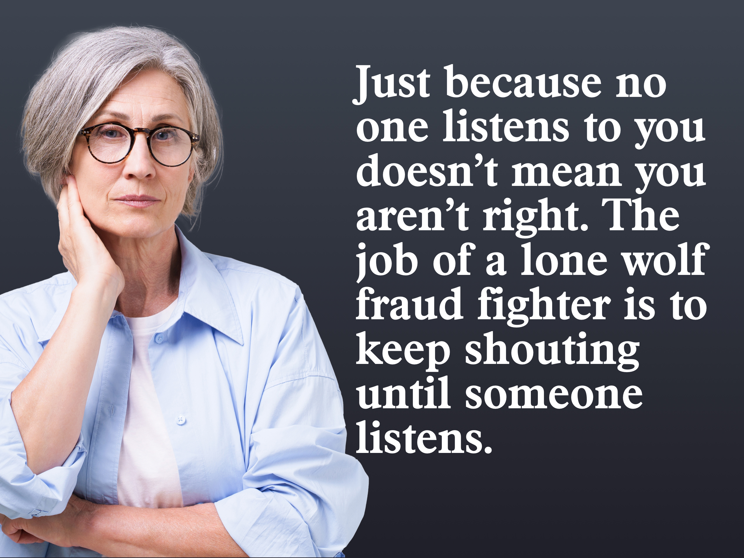 Remember this lone wolf fraud fighters ?Just because no one listens to you doesn’t mean you aren’t right. The job of a lone wolf fraud fighter is to keep shouting until someone listens.