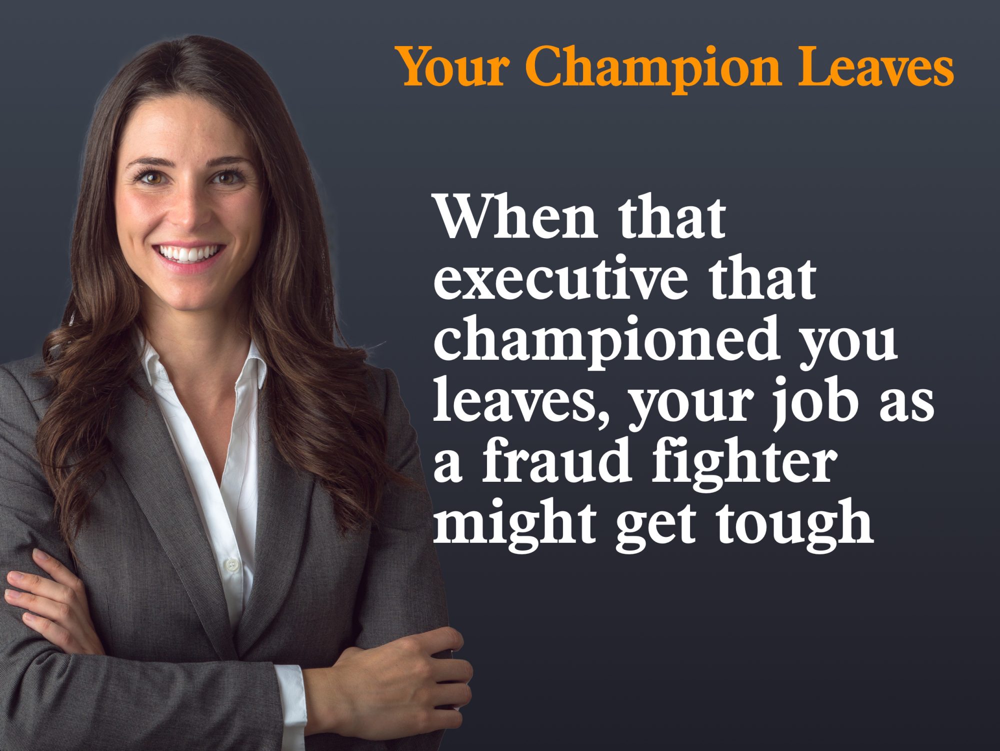 Your world is about to change. Without your sponsor, it will be up to you alone to convince the company to do the right thing. To care about fraud risk.