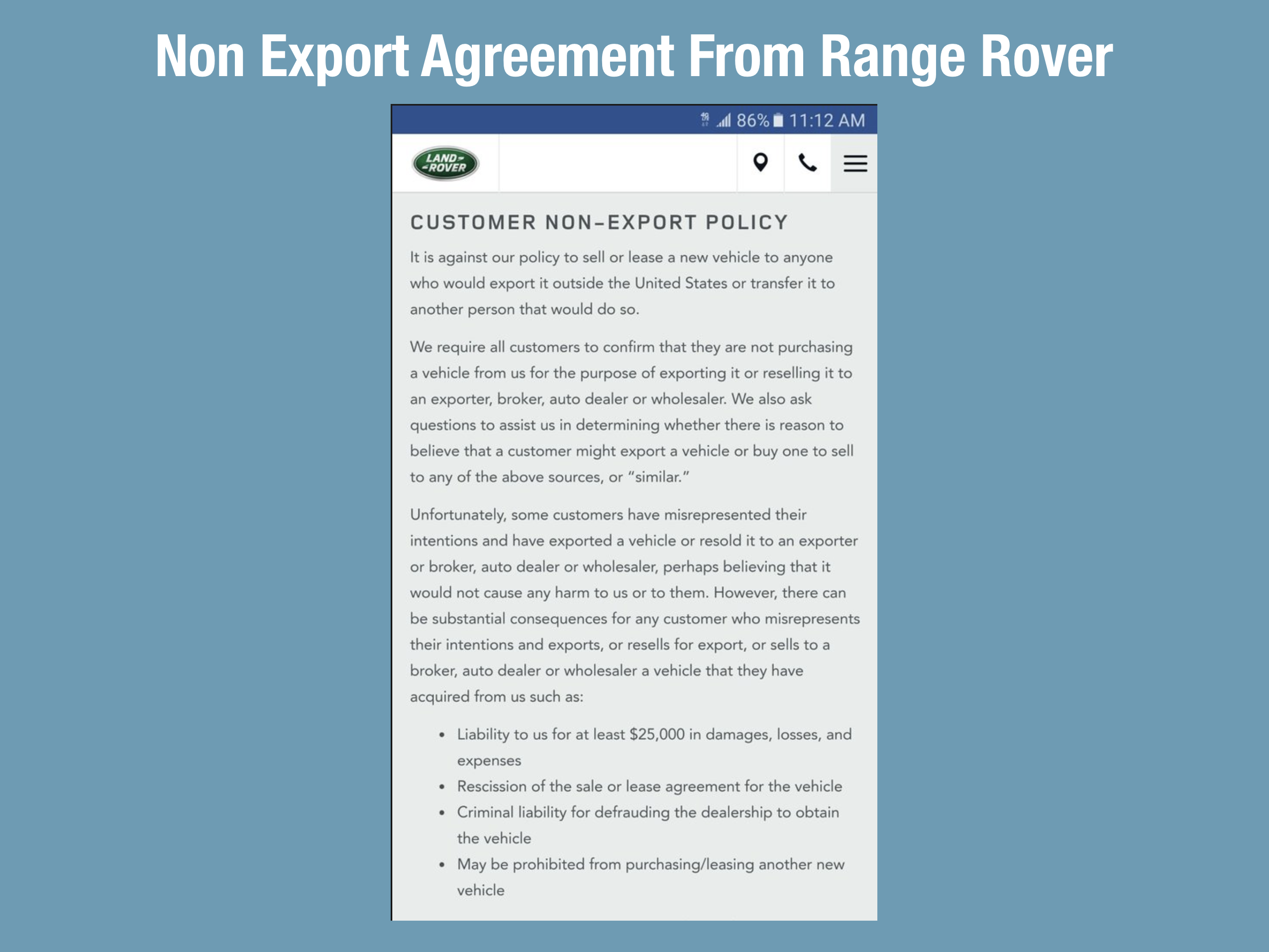 The problem with Straw Buyers is that they often get caught after a couple of months. In the case of Travis for example. After 3 of the cars were exported, he got flagged by US Customs and Border Protection when they examined the paperwork.