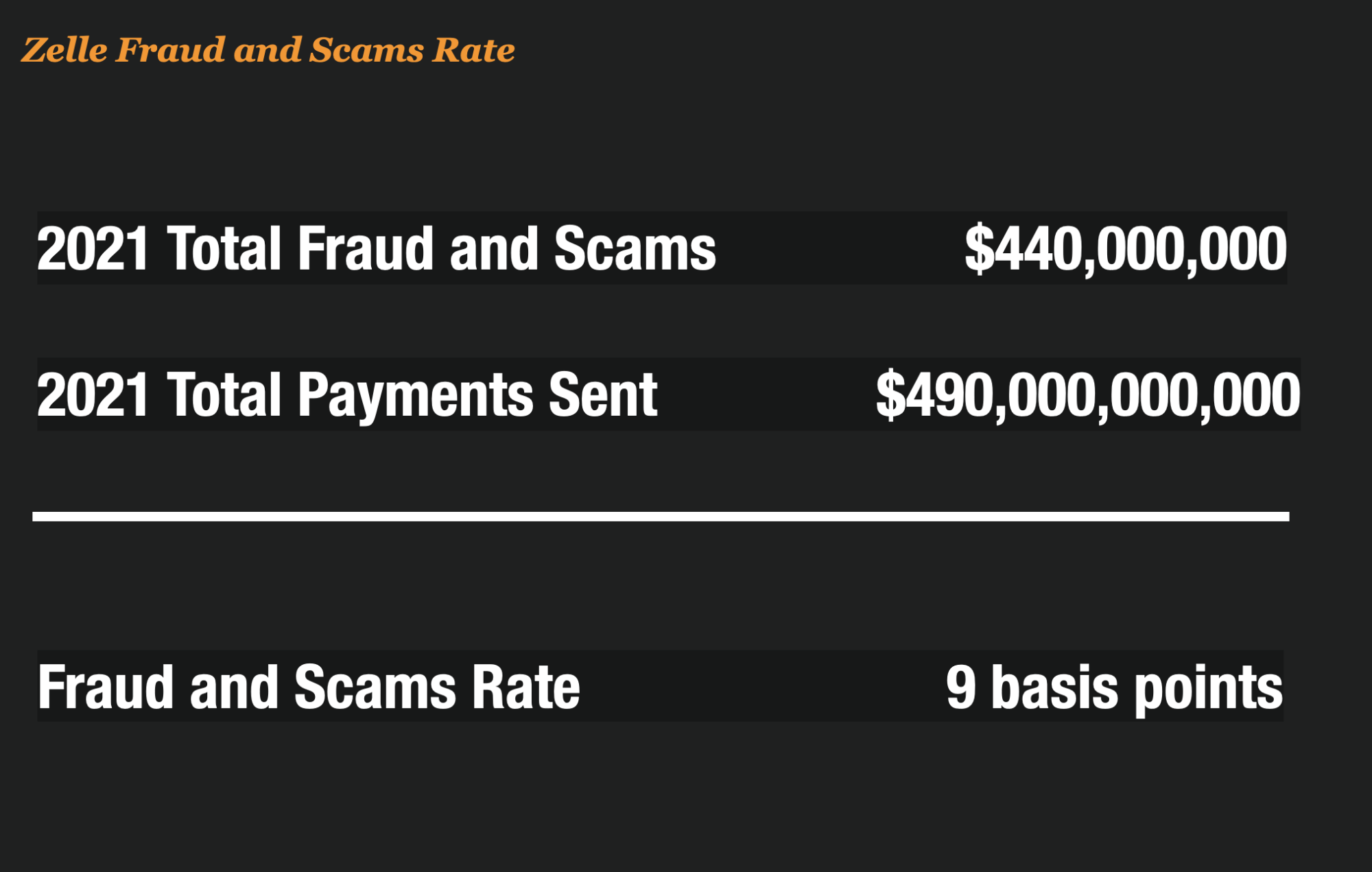 Using math, we can glean that accounts for about 9 basis points in total fraud and scams. Zelle claims that its platform is 99.9% fraud-free, and its self-reported numbers seem to confirm this.