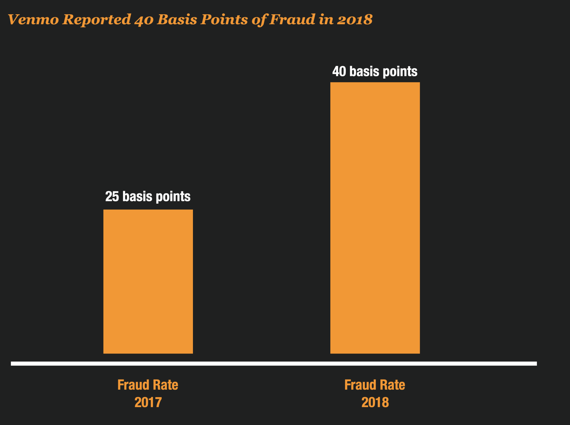 In 2018, Venmo reported that its fraud rate increased to 40 basis points from its baseline fraud rate of 25 basis points.