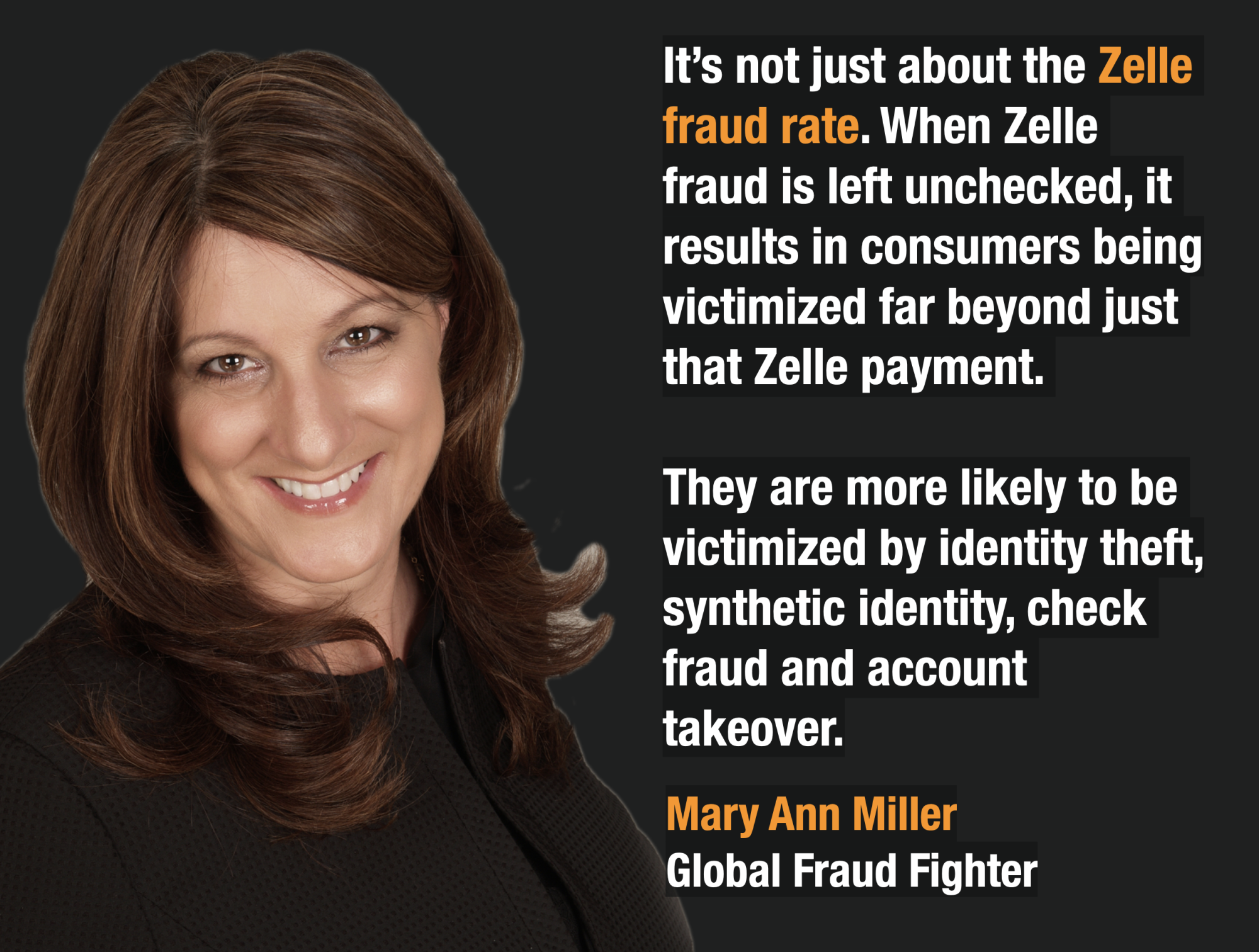 “It’s not just about the Zelle fraud rate,” Miller states, “When Zelle fraud is left unchecked, it results in consumers being victimized far beyond just that Zelle payment. They are more likely to be victimized by identity theft, synthetic identity, check fraud and account takeover.”