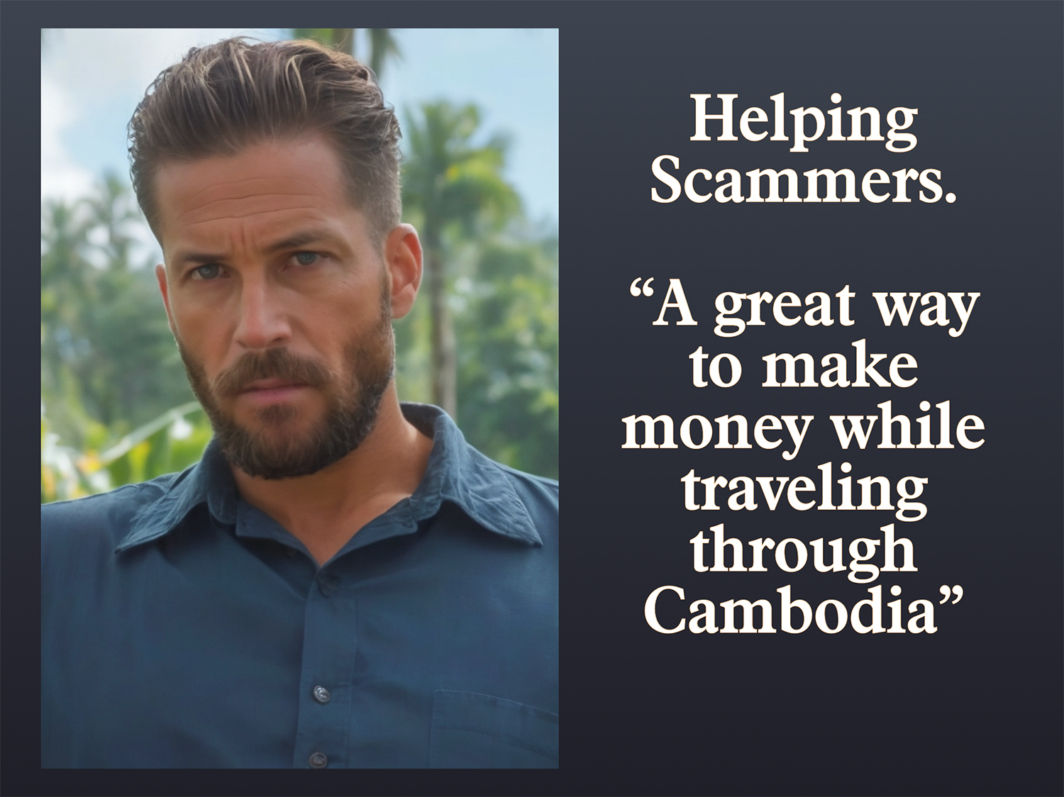 He just happens to be in Cambodia at the moment, but he figures that working in a scam compound could help him make enough to pay for his trip.