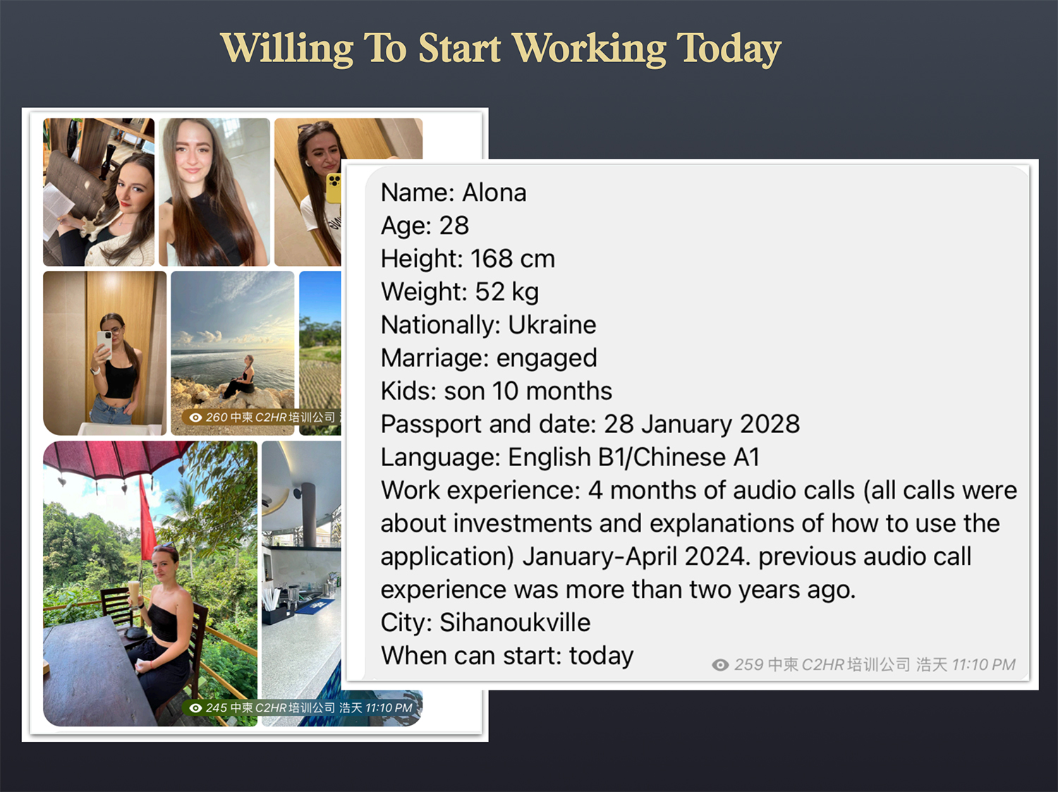 Here is another advertisement for a girl named Alona from Ukraine. She worked this year for four months, explaining to “clients” how to invest in crypto and use fake apps that show the investments growing.