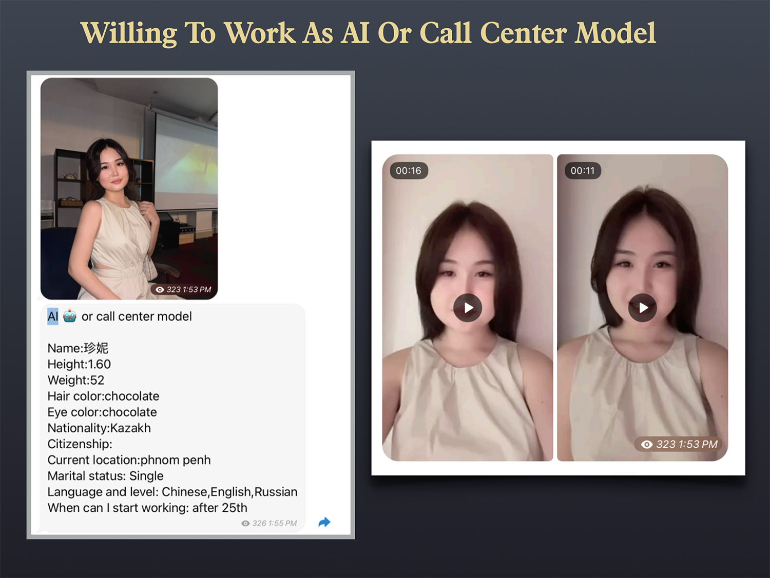 Here’s a typical job-seeking post on the channel. A young woman is seeking an AI or call center model job. She showcases her skills through various pictures and videos and highlights her multilingual abilities. Currently based in Phnom Penh, she aspires to transition to an AI Model role.