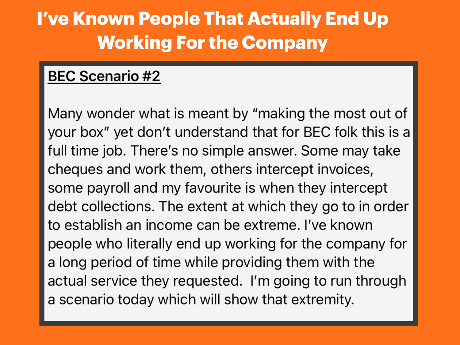 He even says he knows people who will work for companies for an extended period. Learning the business and building trust is paramount in BEC attacks.