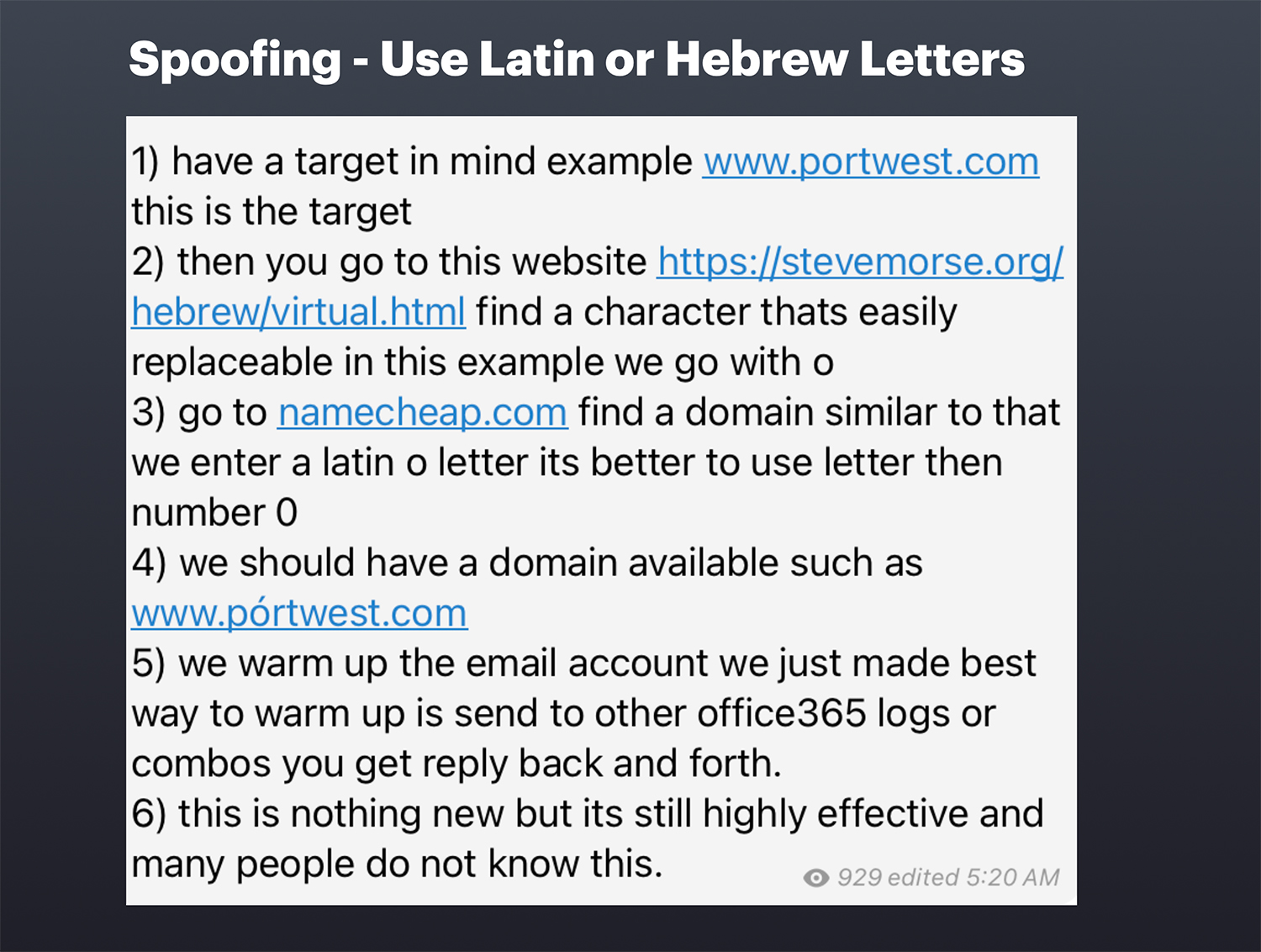 One trick he teaches scammers is to spoof websites using a single letter in a different language. He uses an example below to show how its done.