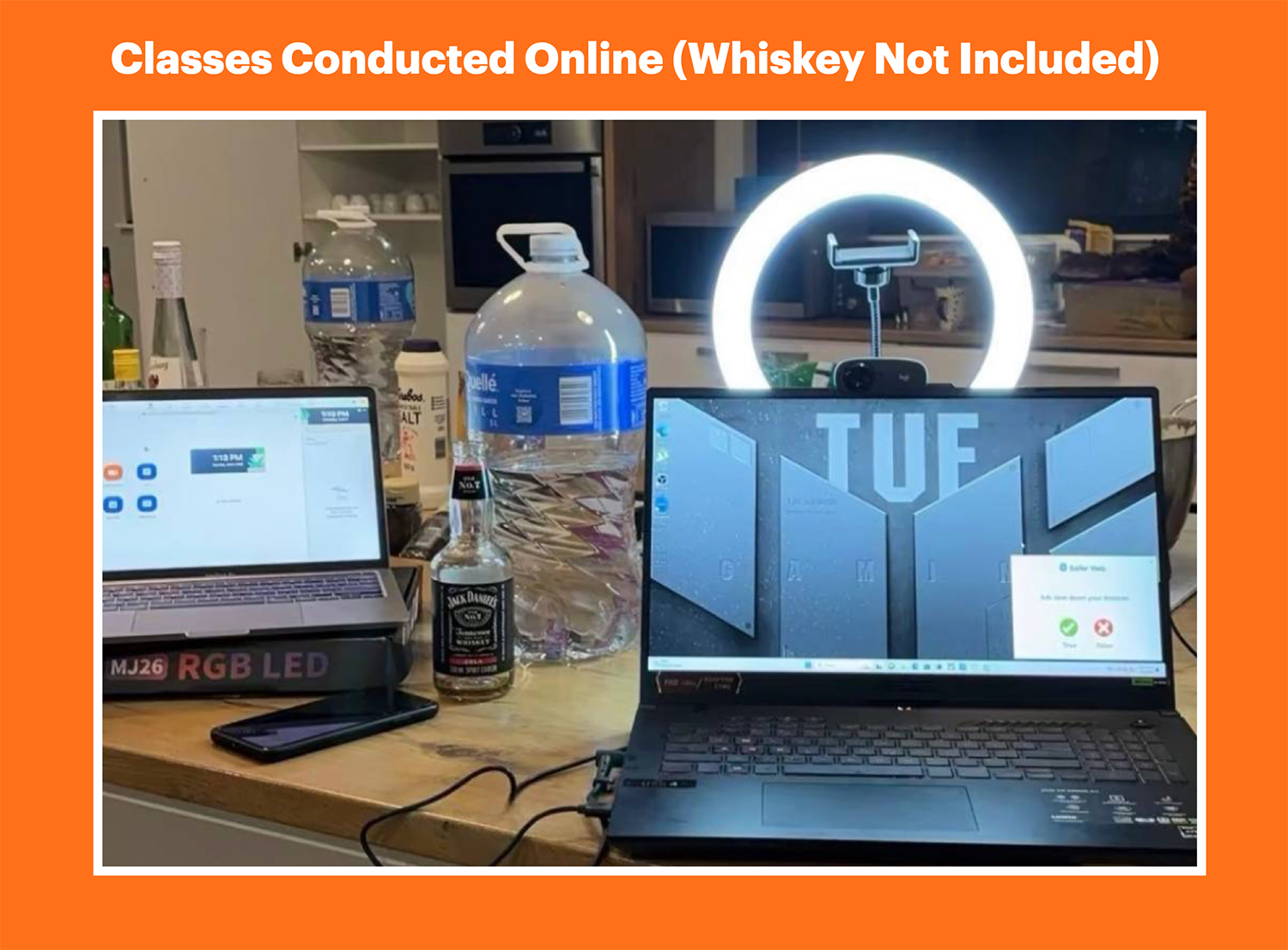 As he prepares for his students, the mentor snaps a photo of his online setup: a ring light, two laptop computers, a large bottle of water, and an empty bottle of whisky.