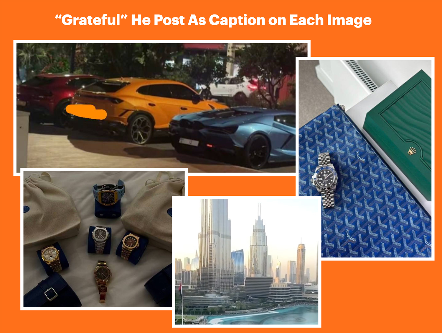 He comments on each photo he posts, “Grateful…” The pictures include luxury cars, watches, and views from his penthouse in Dubai.