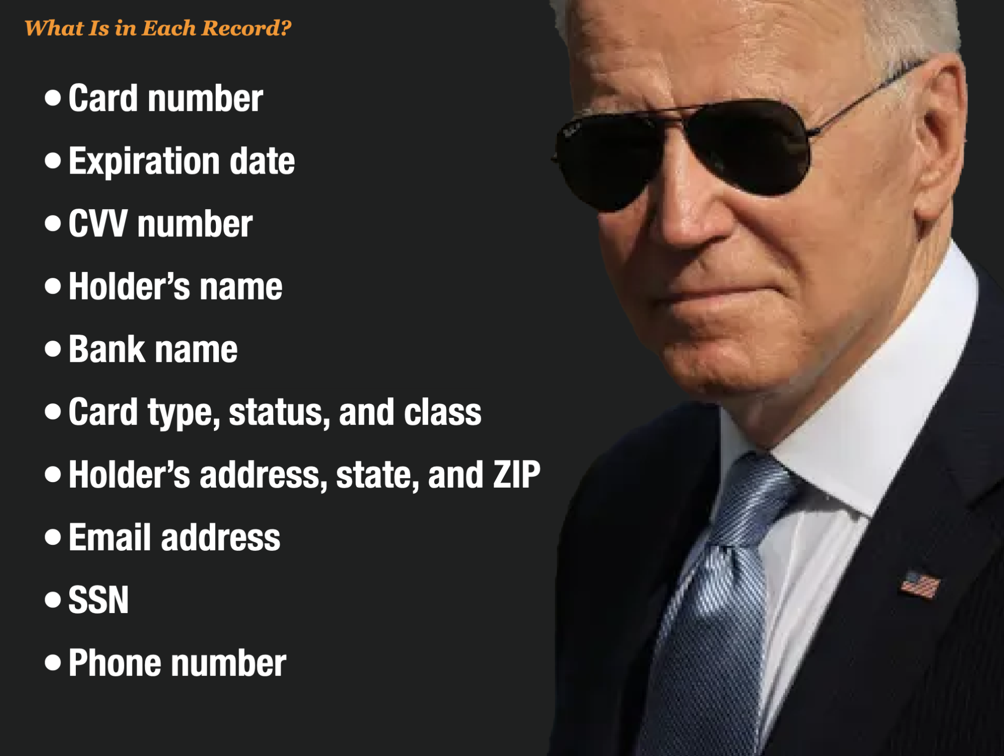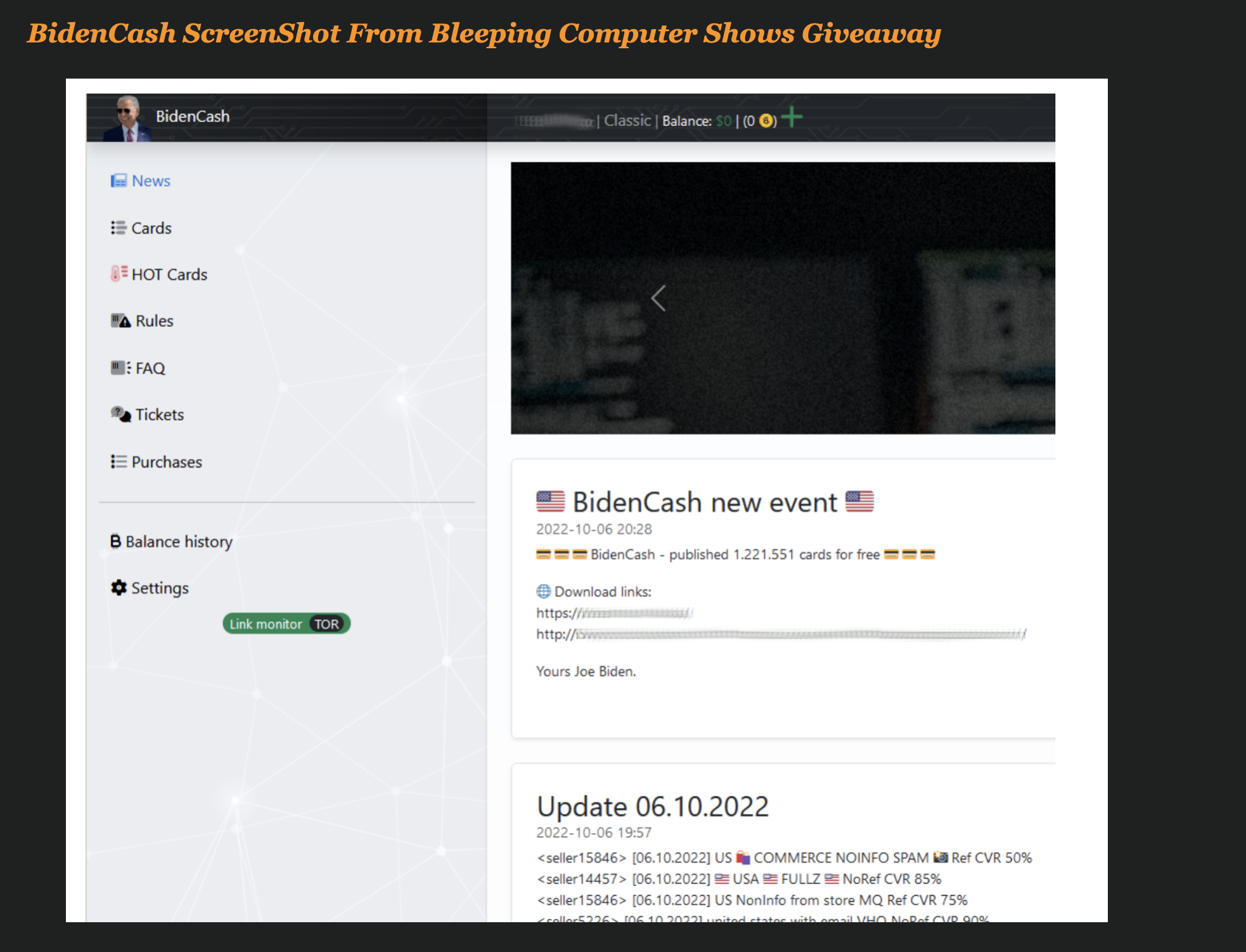 BidenCash is the name of a dark web marketplace for trafficking stolen credit cards, and they are providing the massive giveaway of credit card numbers to promote their shop.