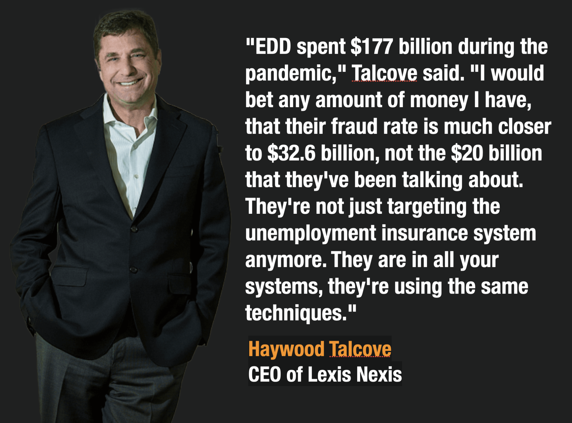 “EDD spent $177 billion during the pandemic,” Talcove said. “I would bet any amount of money I have, that their fraud rate is much closer to $32.6 billion, not the $20 billion that they’ve been talking about. They’re not just targeting the unemployment insurance system anymore. They are in all your systems, they’re using the same techniques.