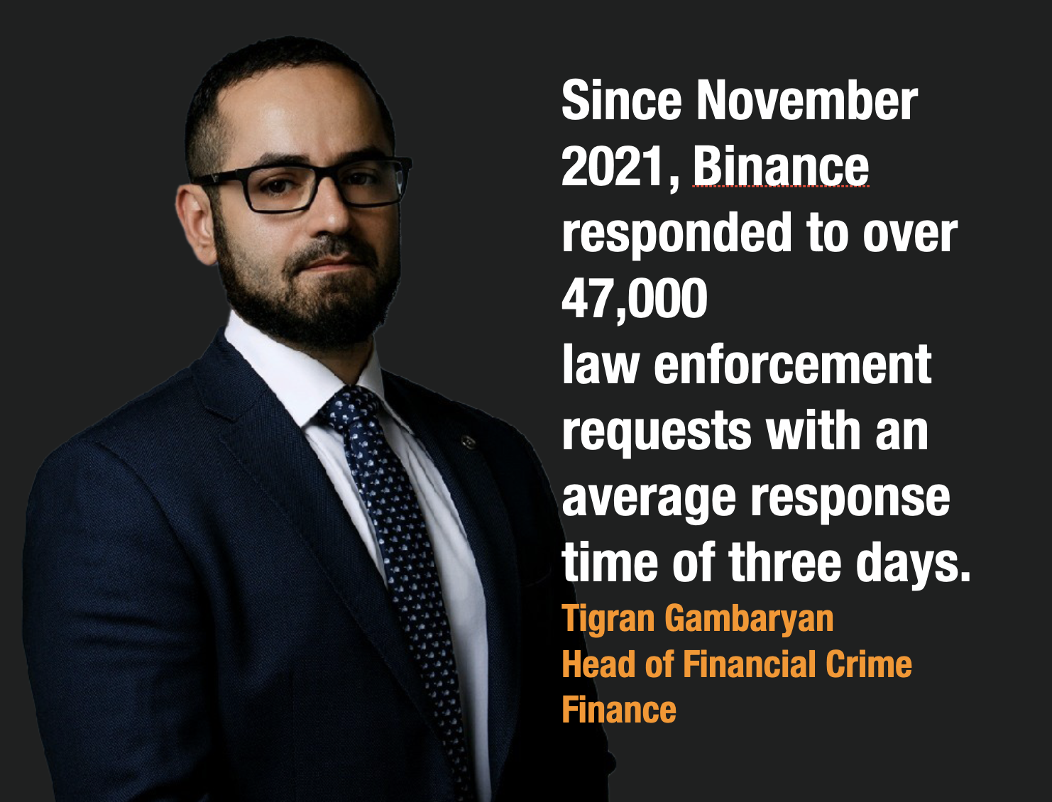 According to Gambaryan, the financial crime compliance team at Binance alone processes 1,300 law enforcement requests a week.
