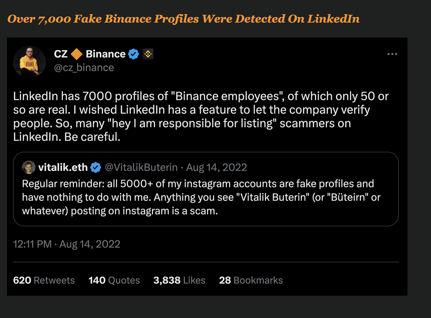 In August of last year, Changpeng Zhao, the CEO of Binance, a cryptocurrency exchange, posted a tweet stating that out of the 7,000 profiles of purported “Binance employees” on LinkedIn, only about 50 are authentic, and he described some of these profiles as “scammers”.