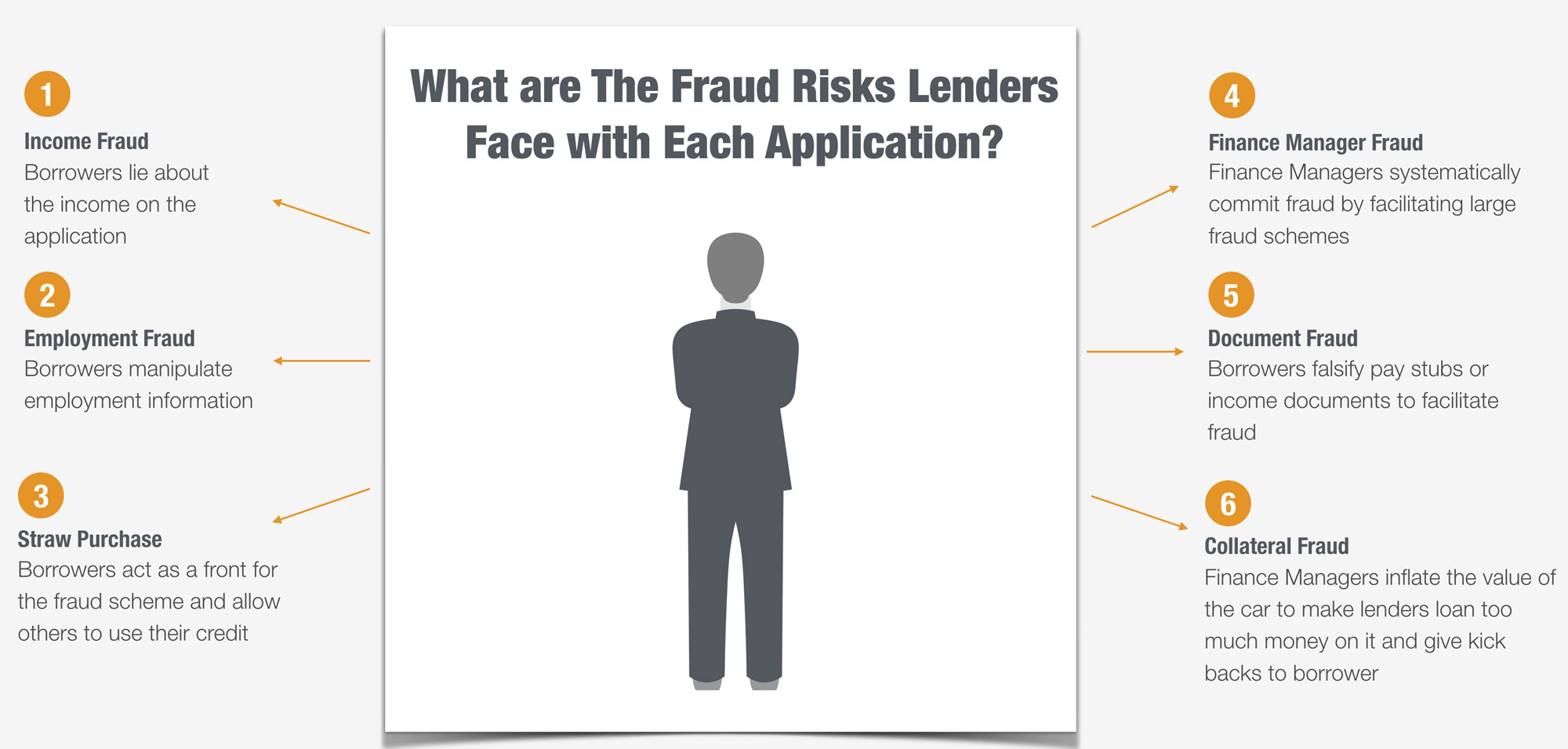 Income fraud is the most common type of auto fraud and borrowers may lie about their income to qualify for a car that they cannot really afford or to get a better interest rate. Look for red flags of potential income fraud: