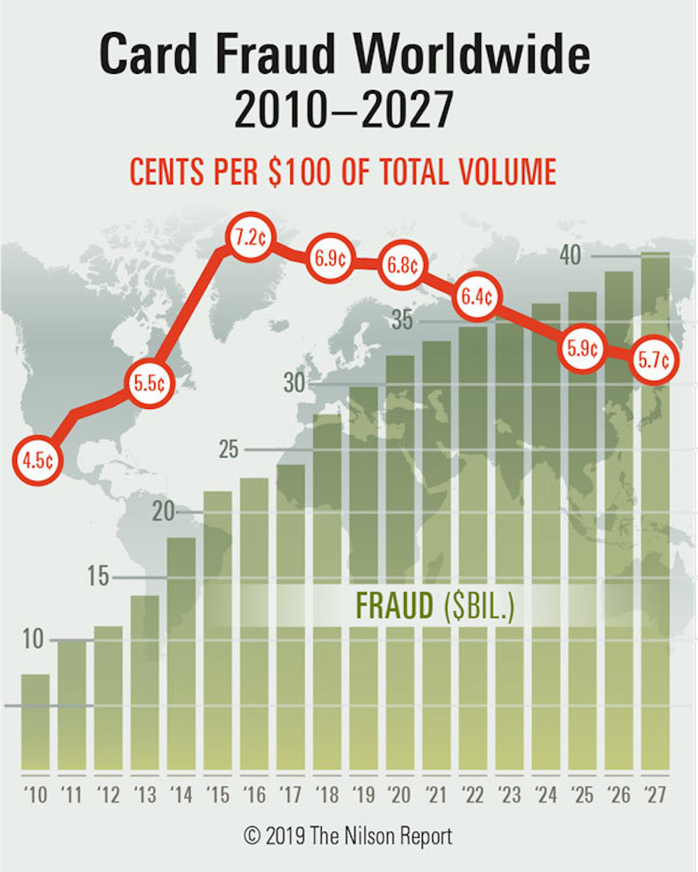 Even with Chip Card technology, Nilson is projecting that Card Fraud losses will continue their upward trend and rise to over 40 billion within the next 10 years.