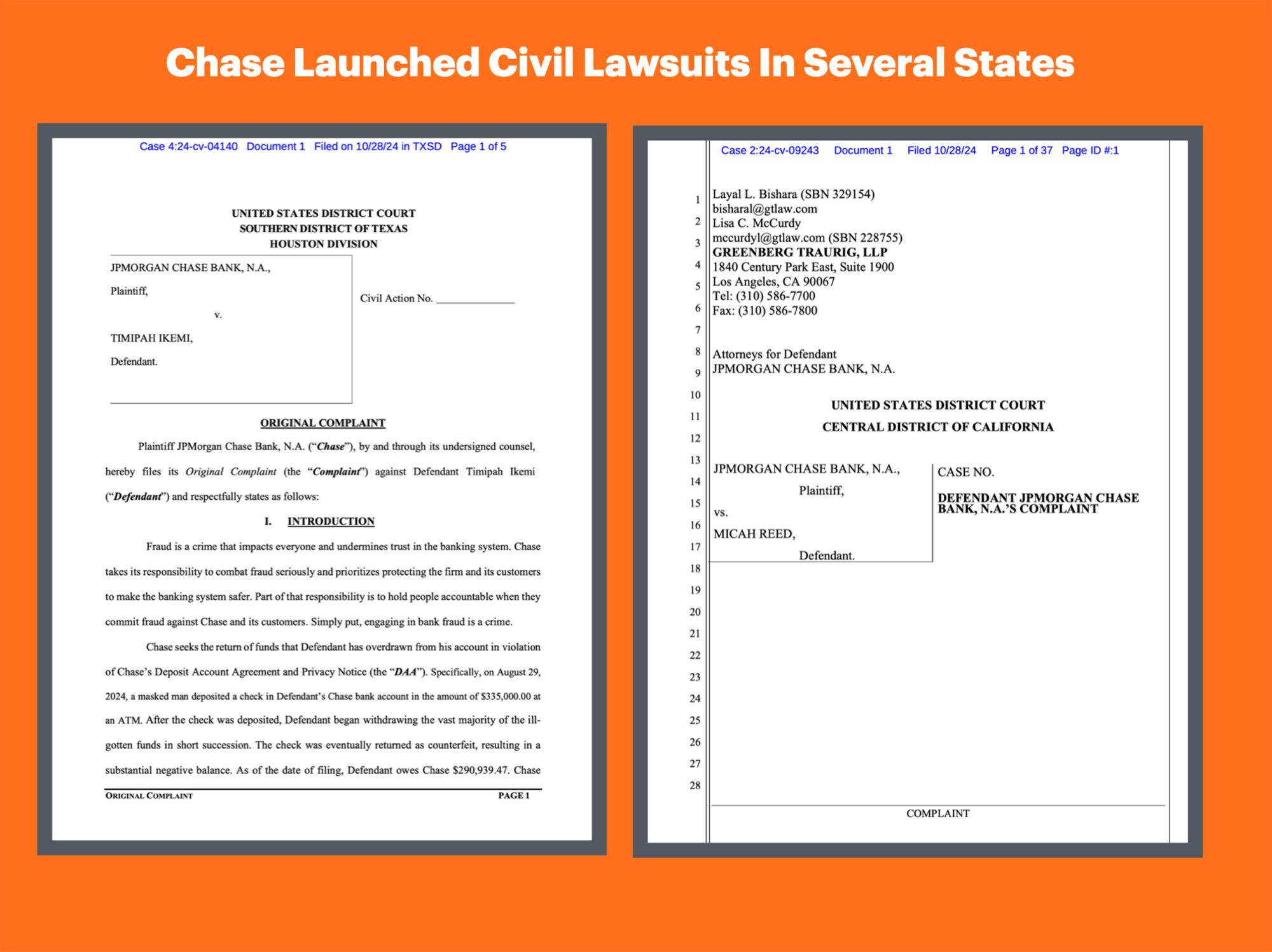 In the first lawsuit filed Monday in the U.S. District Court for the Central District of California, JPMorgan Chase Bank accused a Los Angeles resident of orchestrating an alleged check fraud scheme.