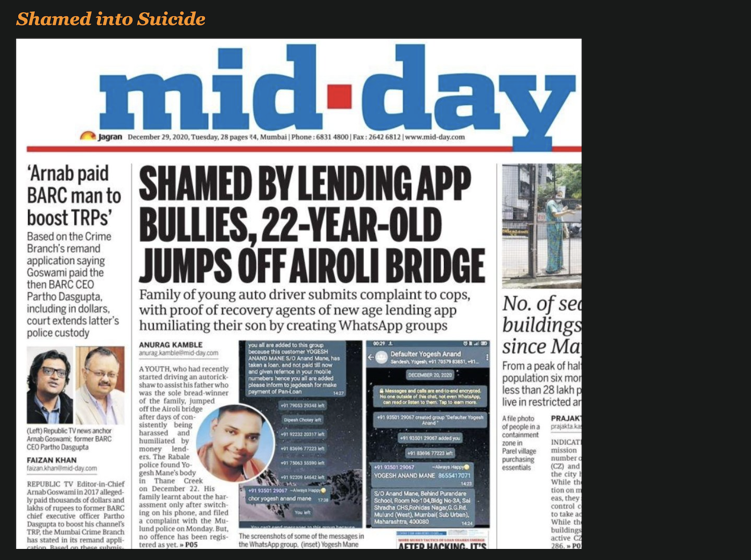 The Hindu Times reports that in a year when everything went online due to the pandemic, so did usurious moneylenders and the problem is so bad that it is causing a wave of suicides by shamed borrowers that feel they can’t carry on. There have already been 5 reported suicides by people that had reportedly fell victim to the scam.