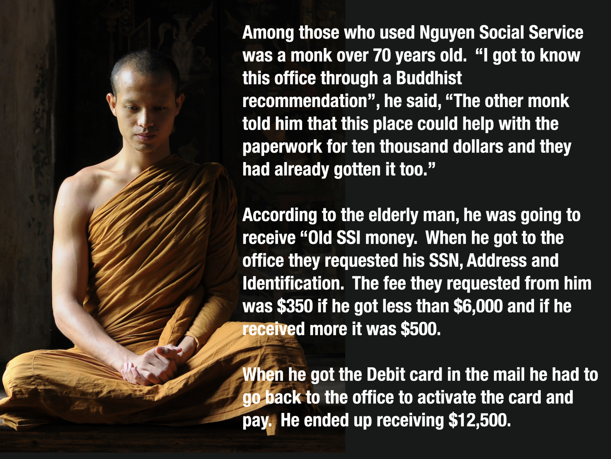 So when Nguyen Social Services opened, they could help virtually anyone that claimed that they were self employed or independent contractors. It is a well known fact that Vietnamese immigrants are very entrepreneurial and most start or own there own businesses.