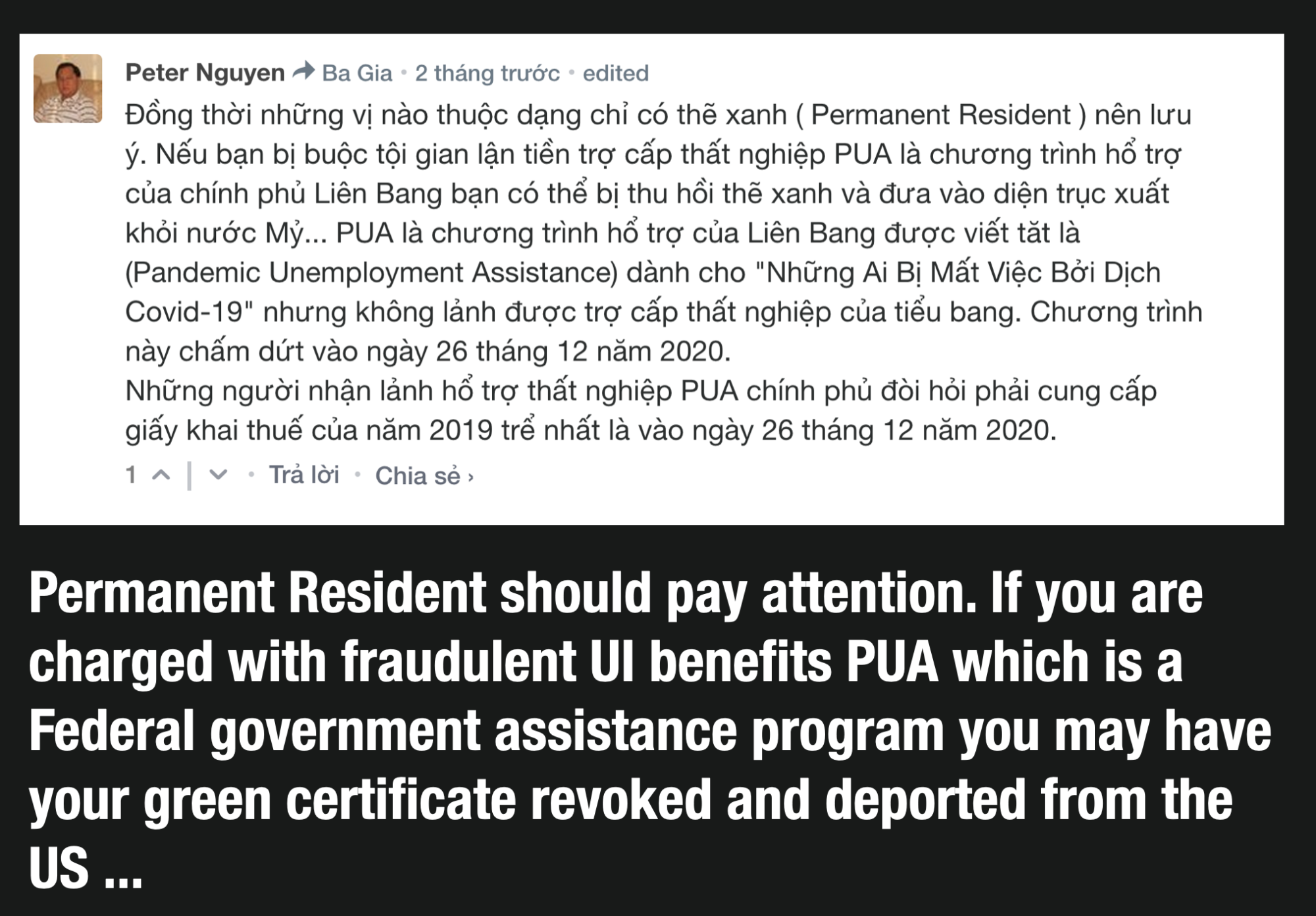 One internet poster, Peter Nguyen warned recent immigrants and green card holders that if they were found to have committed fraud that they could have their cards revoked and they could be deported.