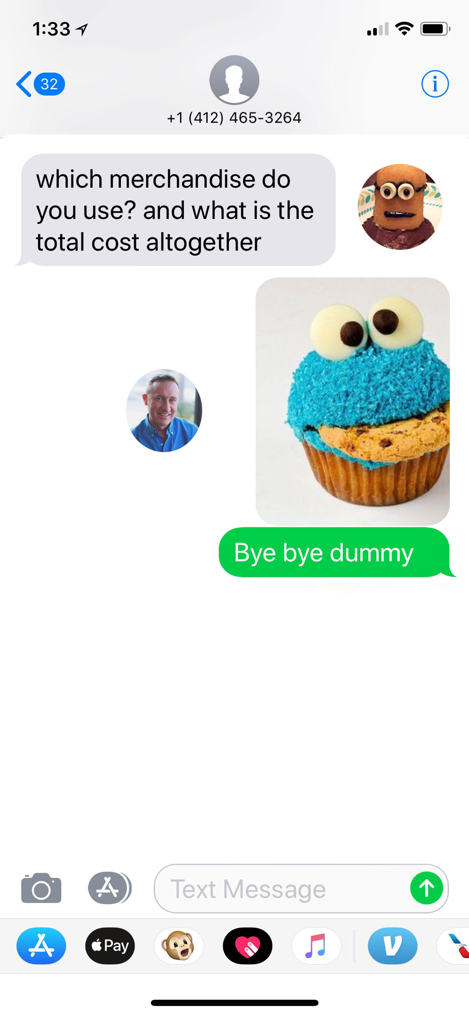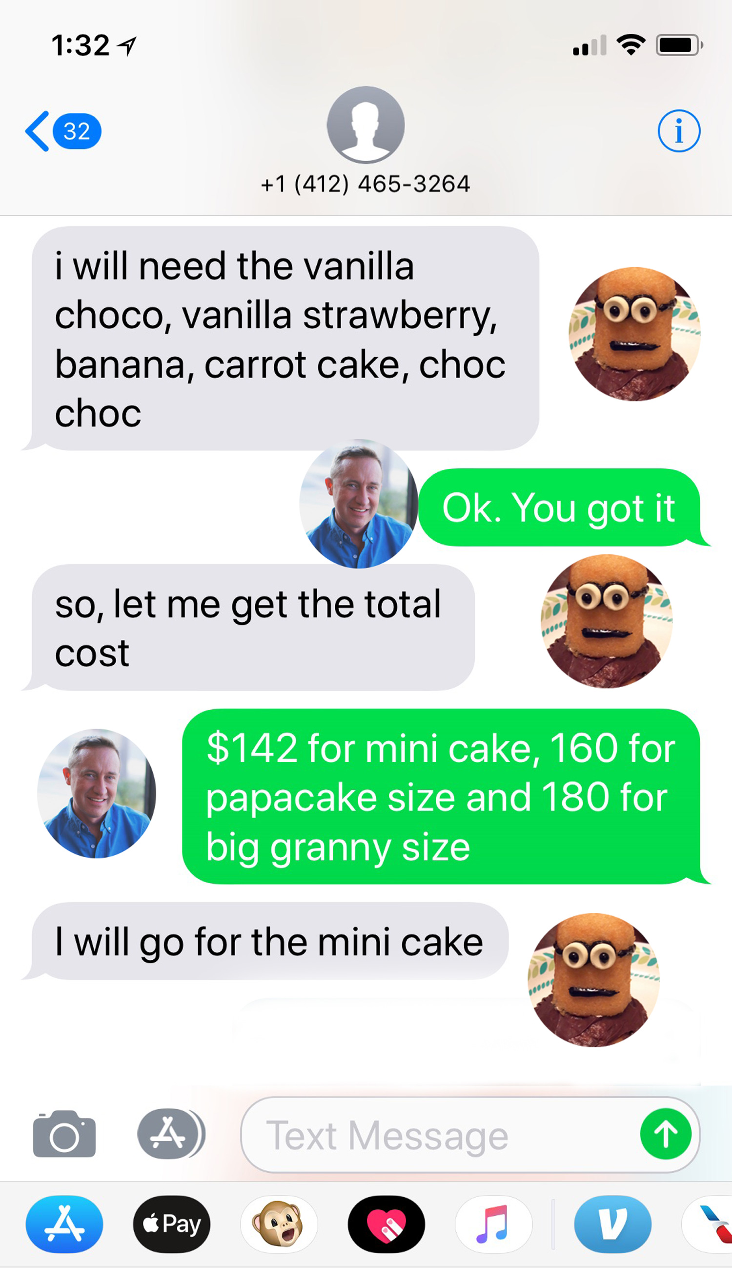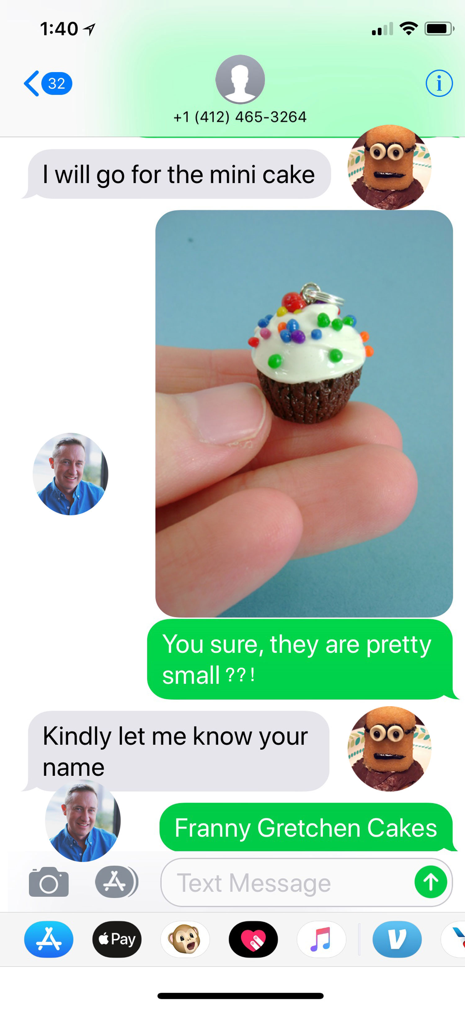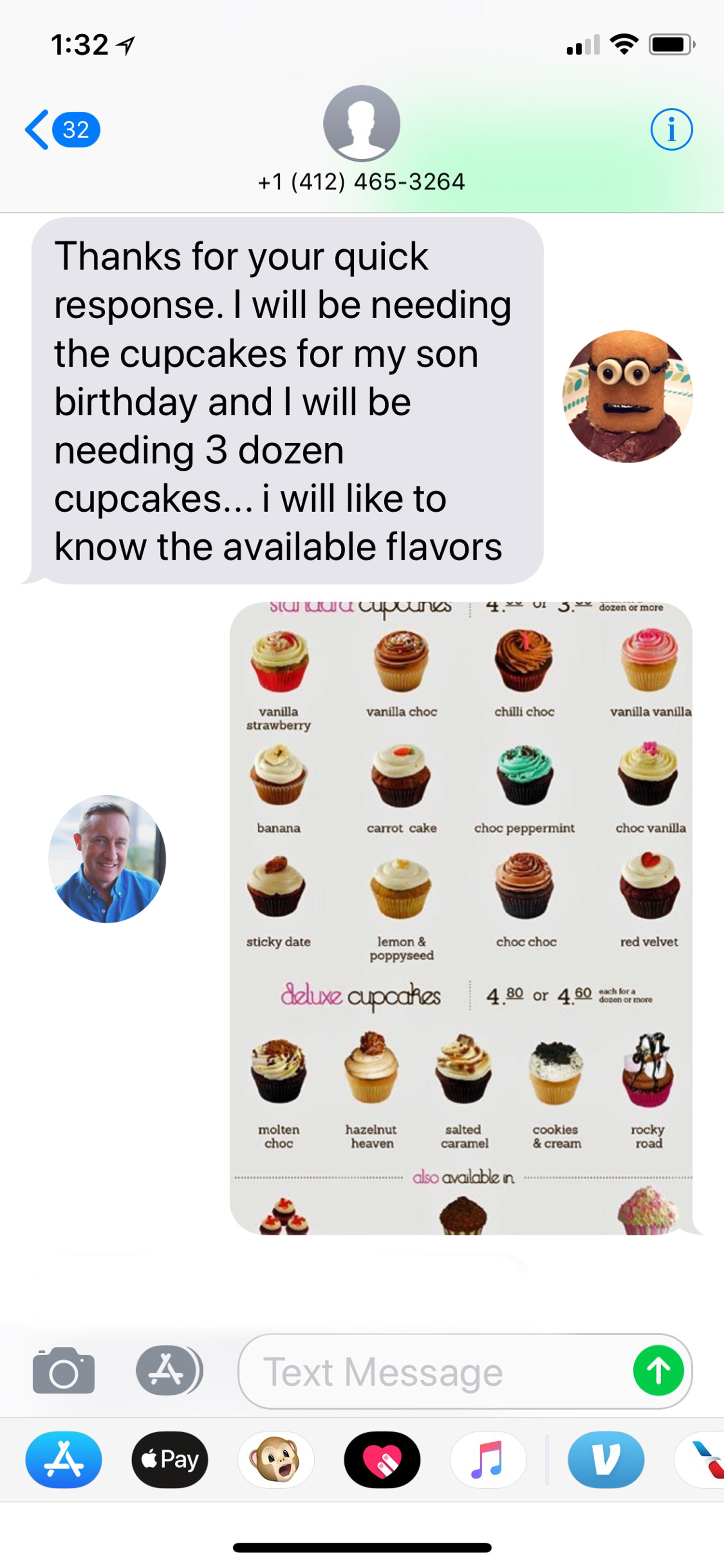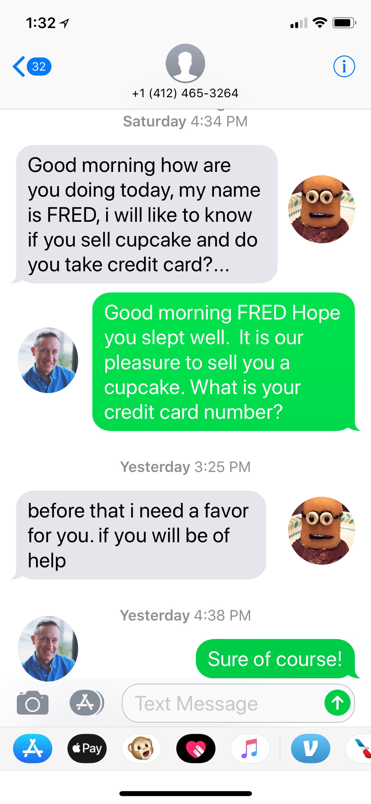 I got an interesting text out of the blue from a fella named Fred.  Fred wanted a cupcake.   How he got my number or why he thought I sell cupcakes, I will never know but it became clear in the end what he really wanted.