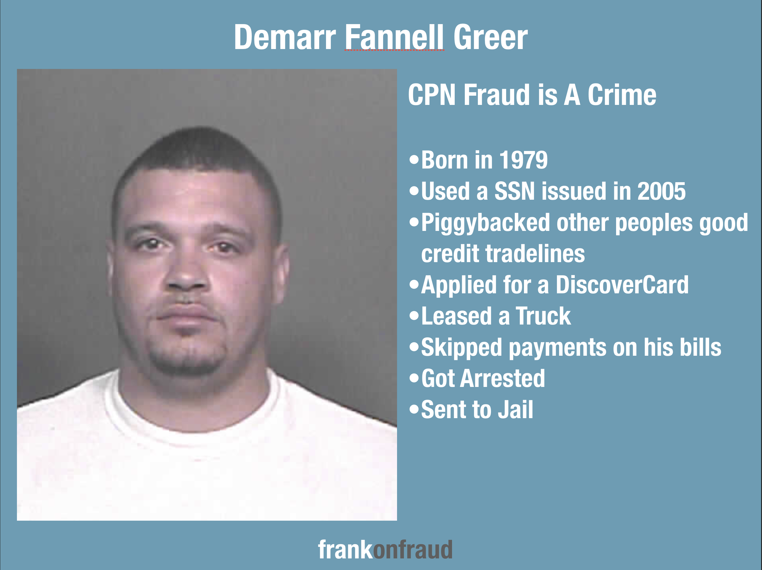 I often hear from people that using a CPN to apply for credit is completely legal. But they are wrong. You can ask DEMARR FANNELL GREER of Edmond, Oklahoma, who was just sentenced to 24 months in prison for fraudulent use of a Social Security Number.
