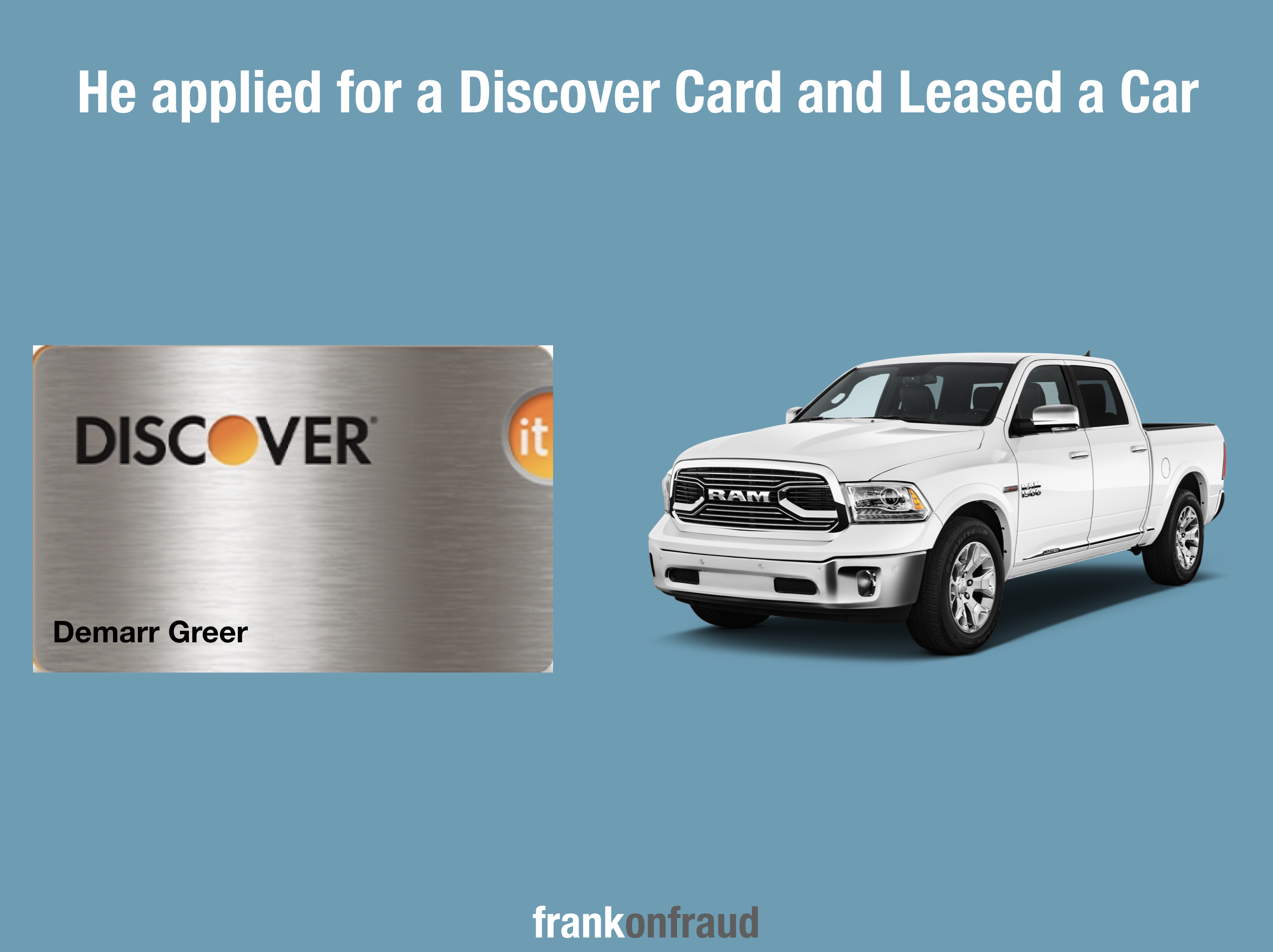 After establishing good credit, he allegedly used the number to apply for a Discover Card and for a lease on a 2016 Dodge crew cab pickup. He leased the car from David Stanley Dodge using his newly created synthetic identity and they were none the wiser.