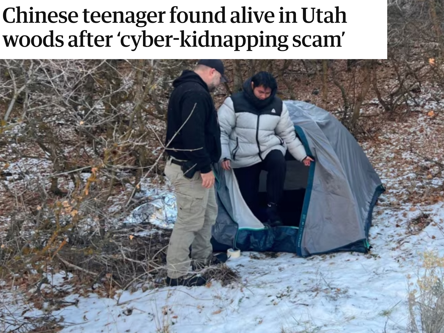 In January of 2024, A Chinese exchange student fell victim to a “cyber-kidnapping” scam, in which his parents were extorted for $80,000, was found alive but “cold and scared” in a tent in the Utah.