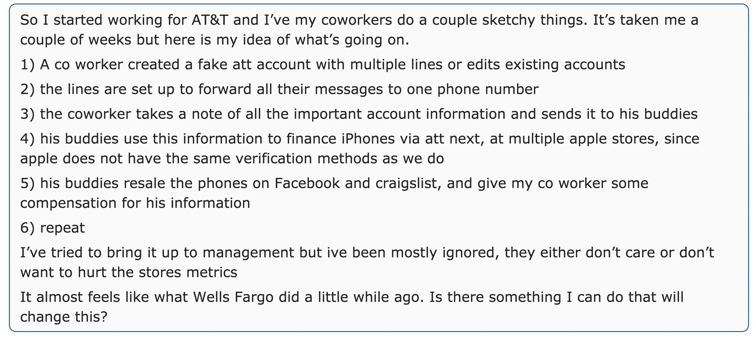 Second – AT&T is in danger of ignoring a whistleblower. The employee is clearly sending out alerts to his managers that someone is setting up fake accounts to steal from the company. The employee may be using dormant accounts that belong to real people. Those consumers are victims of fraud.