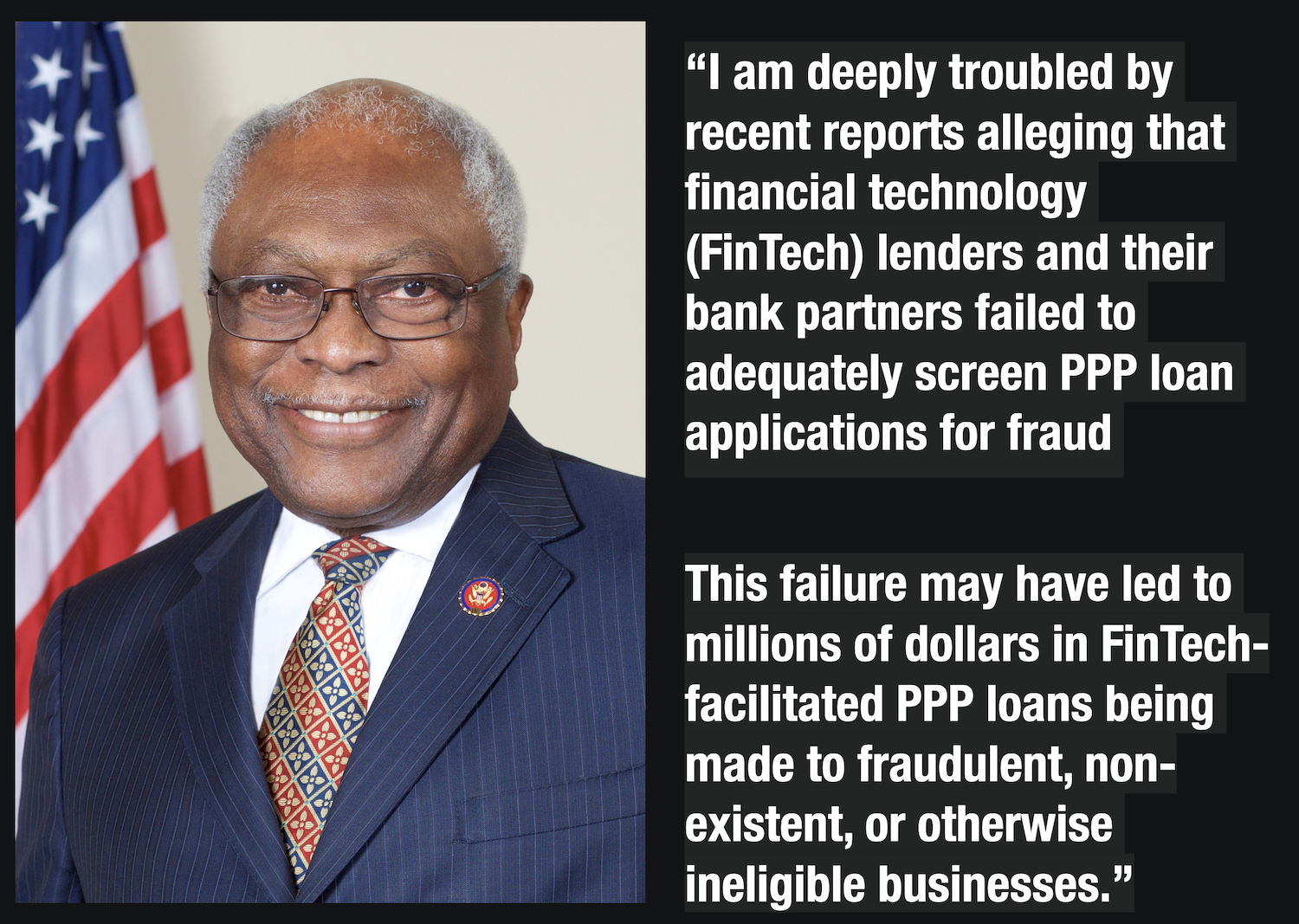 Yesterday, Rep. James E. Clyburn, Chairman of the Select Subcommittee on the Coronavirus Crisis, sent letters to four financial technology (FinTech) firms and partner banks seeking documents and information related to their handling of Paycheck Protection Program (PPP) loans.