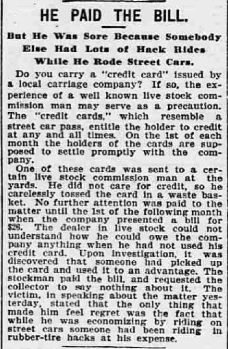 The scoundrel racked up a big bill and skipped town. At the time, it was for the grand sum of $27; in today’s money, that is worth over $700, so it was no paltry sum. The company billed the farmer for the fees at the end of the month, not knowing the card was assumed by a fraudster that happened upon it in the trash.