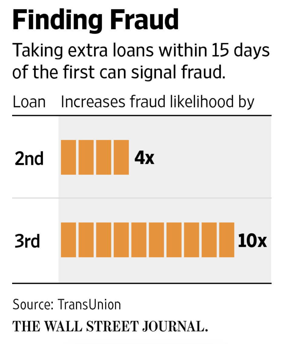 According to the Wall Street Journal, Loan Stacking fraud is surprisingly common. 4.5% of borrowers that apply for and receive an online loan, will go to another online lender to apply for a loan the same day.