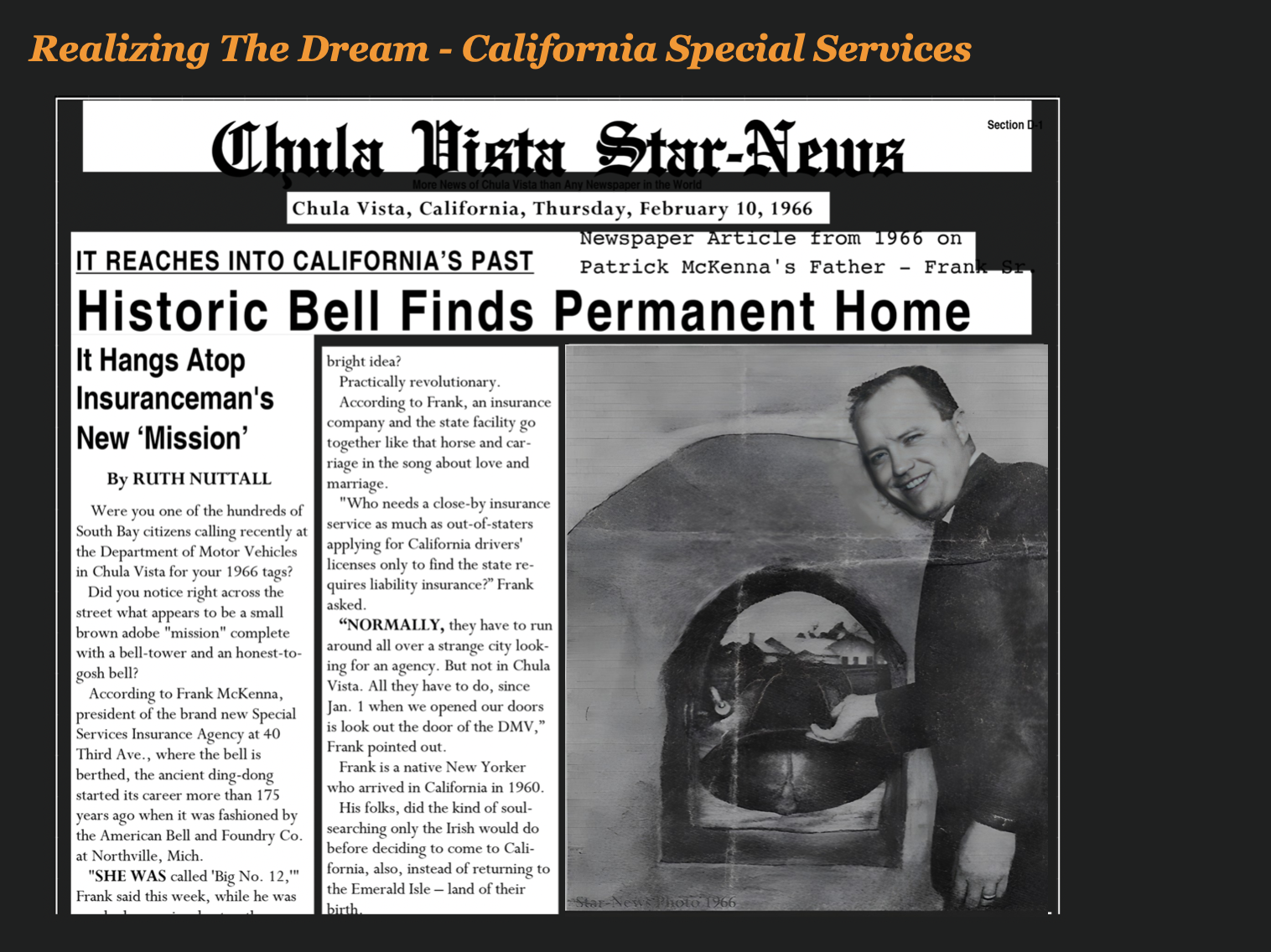 On opening day, he called the local paper and made up an outlandish story of how he had saved a historically important 175-year-old Mission Bell and placed it on top of the agency. The outlandish PR stunt worked, and he was featured on the front page of The Chula Vista Star News.