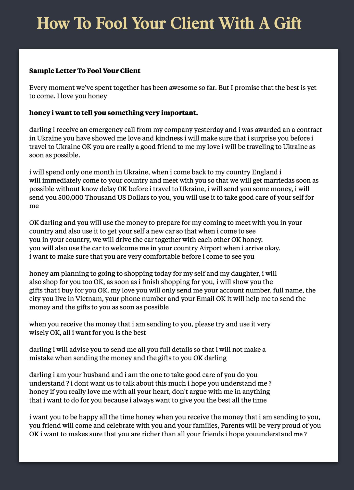 The Yahoo Boys have fully productionalized the romance scam process and use standard “formats” that require nearly zero effort.